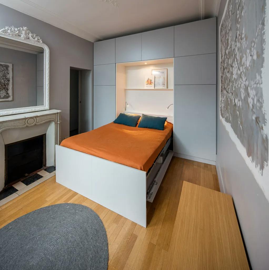 Le défi de cet aménagement était d'intégrer un lit rabattable qui pourrait se dissimuler facilement dans un meuble de rangement, tout en offrant un confort optimal pour la nuit. Le sur-mesure était essentiel pour maximiser l’espace disponible tout en conservant l’élégance de la pièce. La solution trouvée permet non seulement de libérer de l’espace en journée, mais aussi de créer une ambiance cosy grâce à l'éclairage intégré au-dessus du lit.