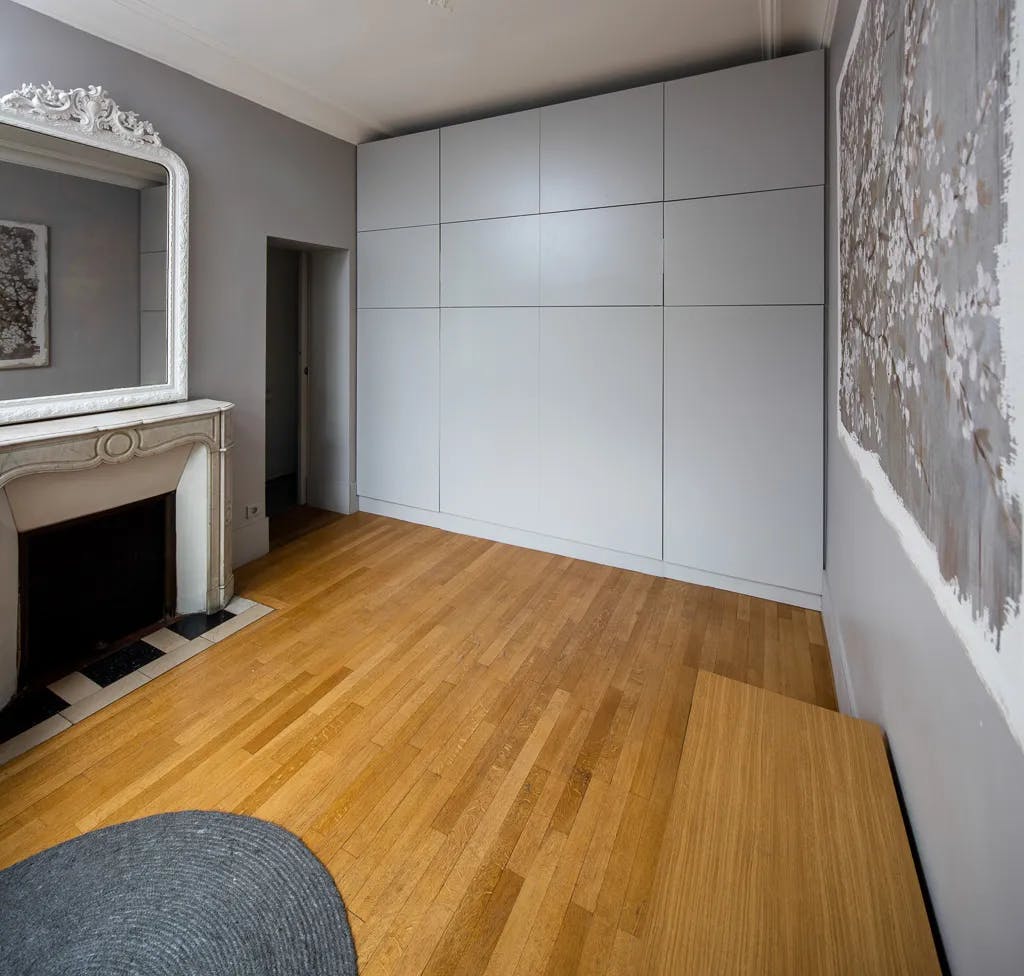 Le choix des finitions est subtil, avec des tons clairs pour la structure du meuble, qui s’intègrent parfaitement dans la pièce, tout en préservant l'élément décoratif comme le miroir ancien. Les étagères ouvertes dans l’alcôve permettent de personnaliser l'espace avec des objets décoratifs, tandis que les tiroirs sous le lit offrent un rangement supplémentaire. L'éclairage intégré permet de lire confortablement, créant ainsi une atmosphère fonctionnelle et agréable dans cette chambre multifonctionnelle.