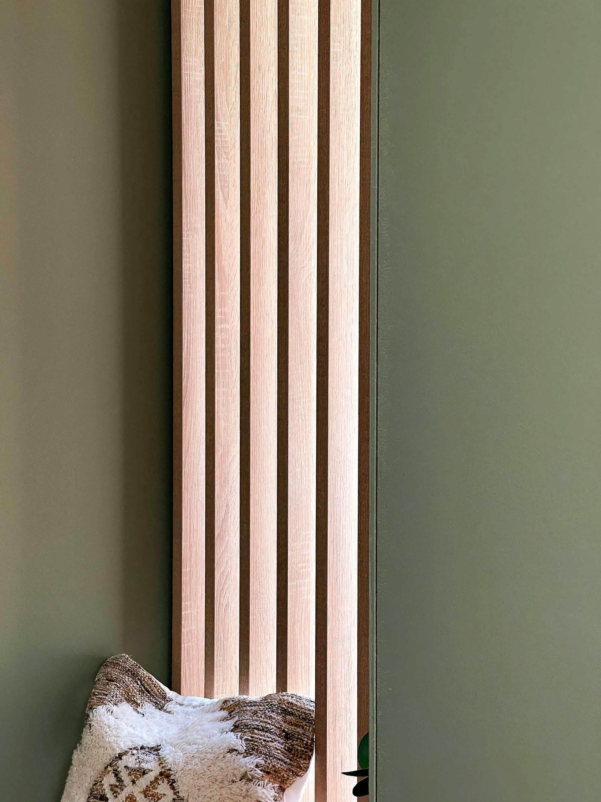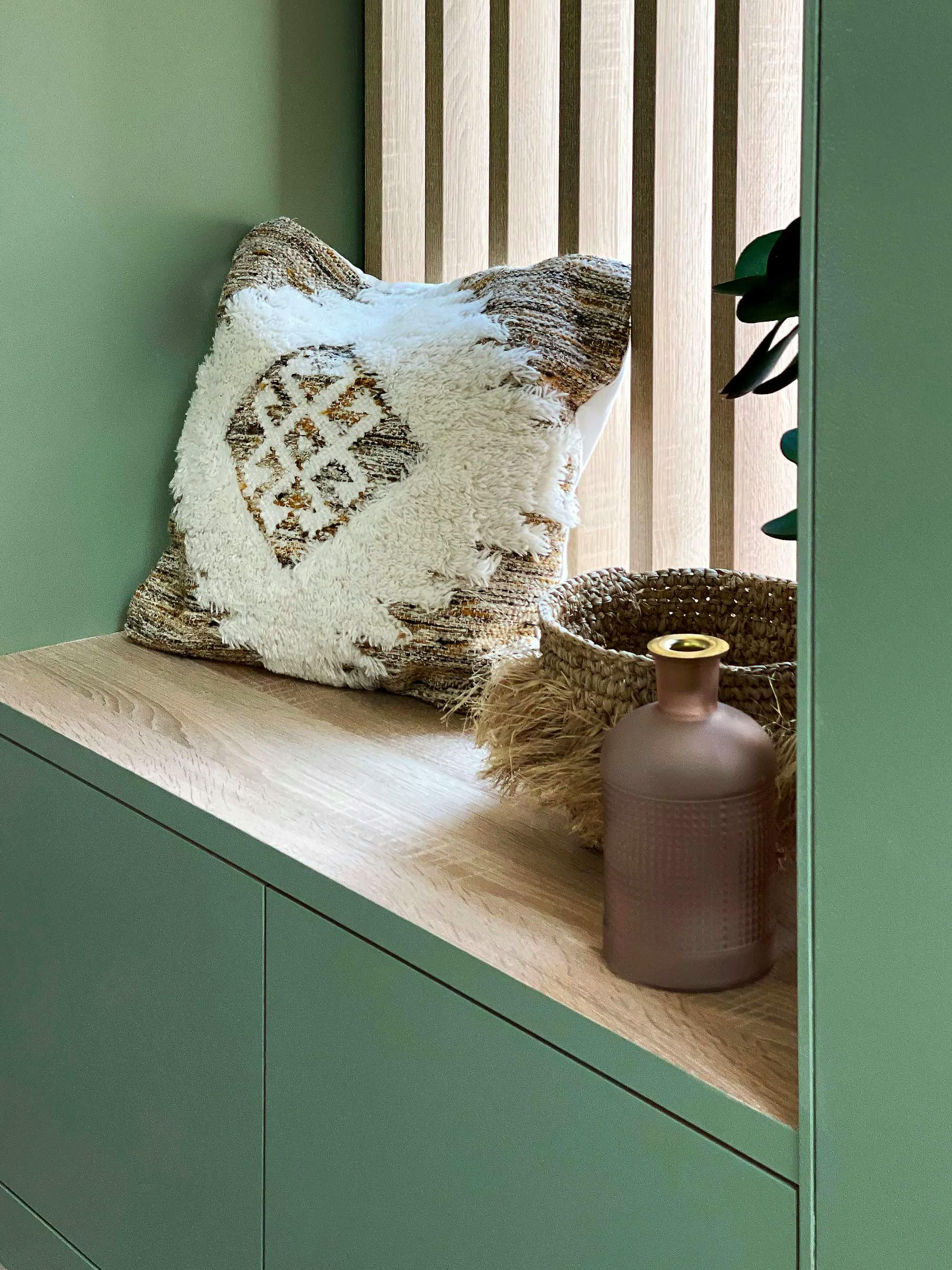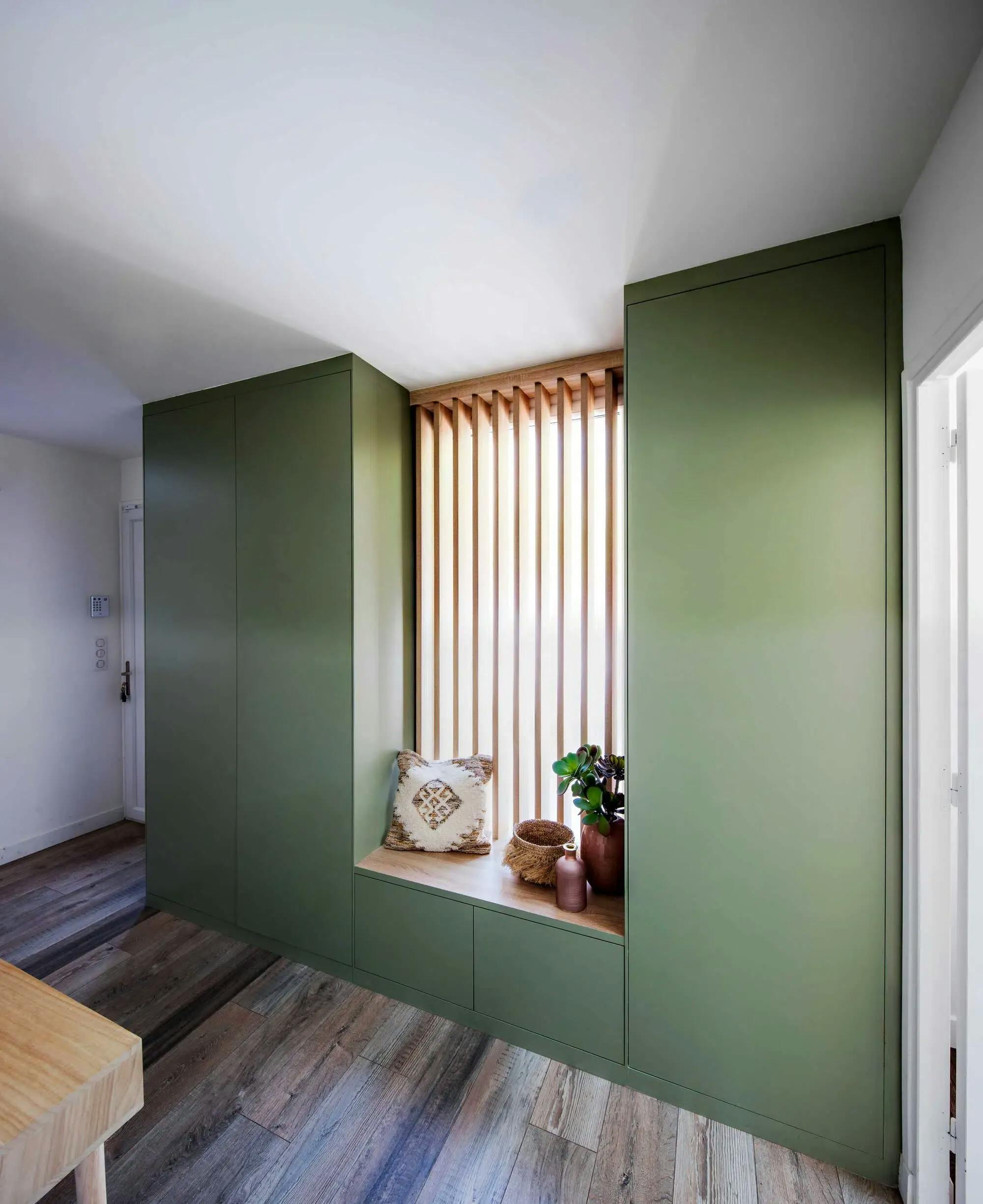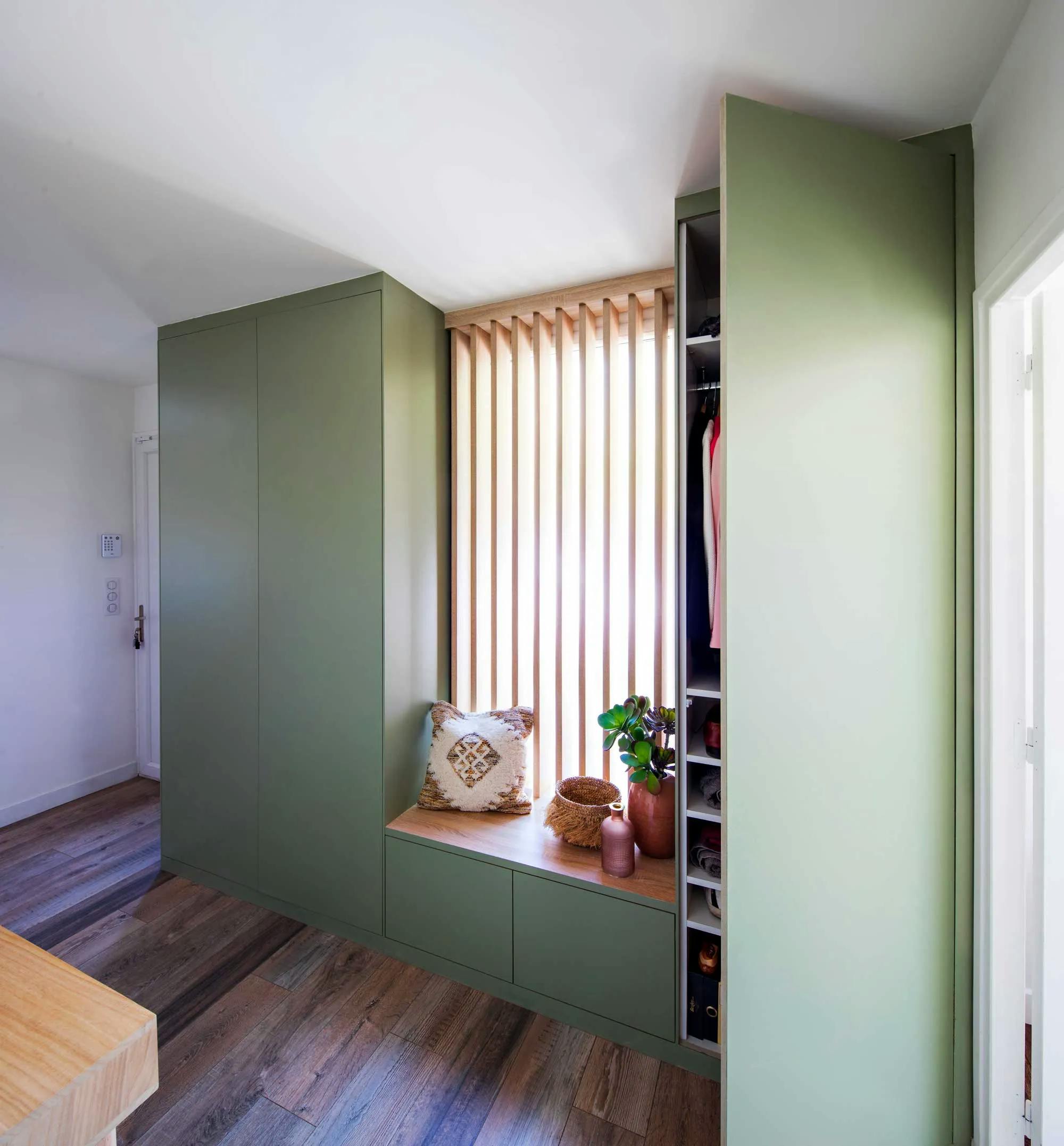 Le meuble intègre des placards pleine hauteur pour dissimuler manteaux et accessoires, ainsi qu’un banc avec rangements bas pratiques. Une cloison en lames de bois ajourées a été ajoutée pour délimiter l’espace tout en laissant passer la lumière. La finition vert mat apporte une touche naturelle et douce, en harmonie avec le bois clair du banc et des lames verticales.