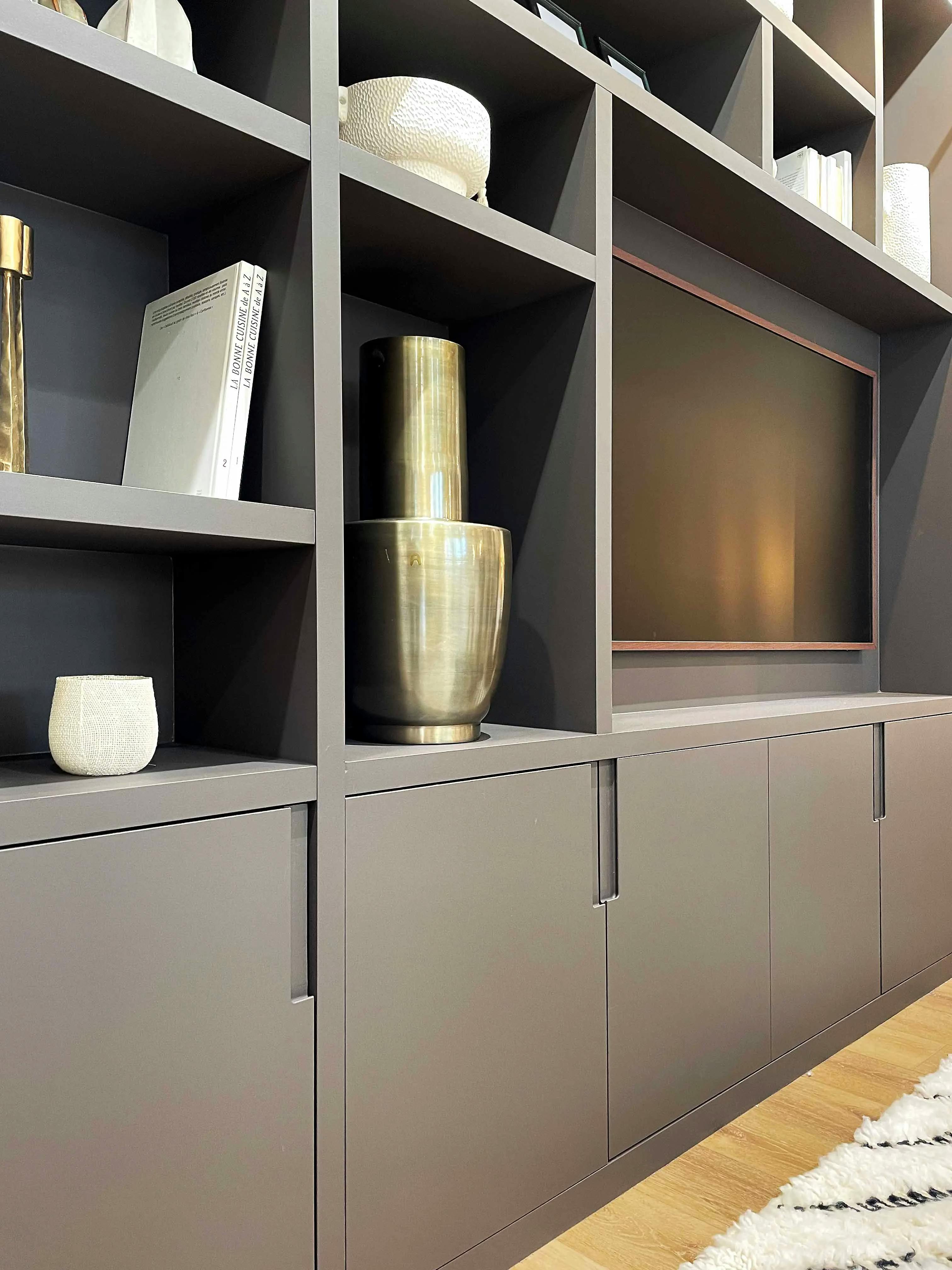 L’enjeu était de créer un meuble qui optimise le rangement tout en mettant en valeur la télévision et des objets décoratifs. Cette bibliothèque murale avec niches ouvertes et placards fermés offre une solution sur-mesure à la fois fonctionnelle et esthétique. Les lignes épurées, les compartiments de tailles variées et la symétrie subtile participent à un design sophistiqué. Le choix d'une couleur foncée ajoute profondeur et raffinement à l’espace.