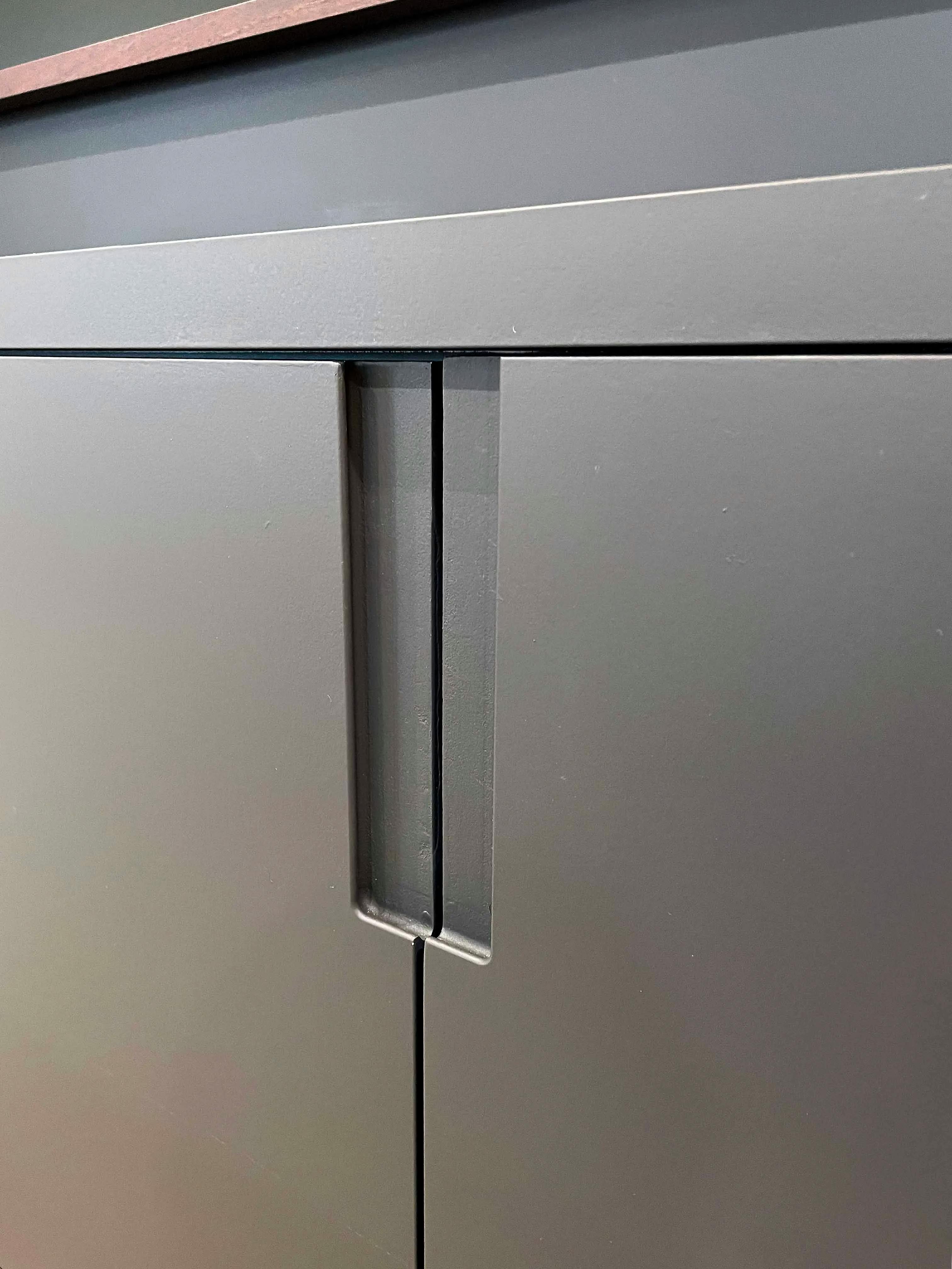En partie basse, l'intérieur des placards est en mélaminé. Les façades et le reste de l'aménagement sont en médium brut. Elles ont été préparées et peintes après la pose de l'aménagement, par un peintre artisan. Il s'agit de la couleur Kombu Brun, dans le nuancier Argile Peintures.