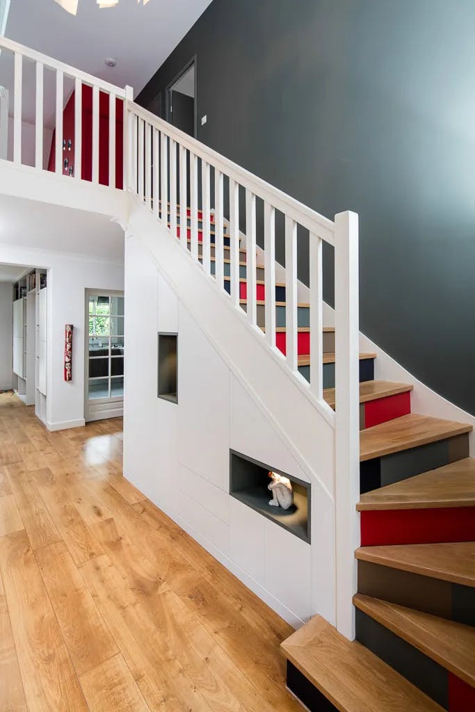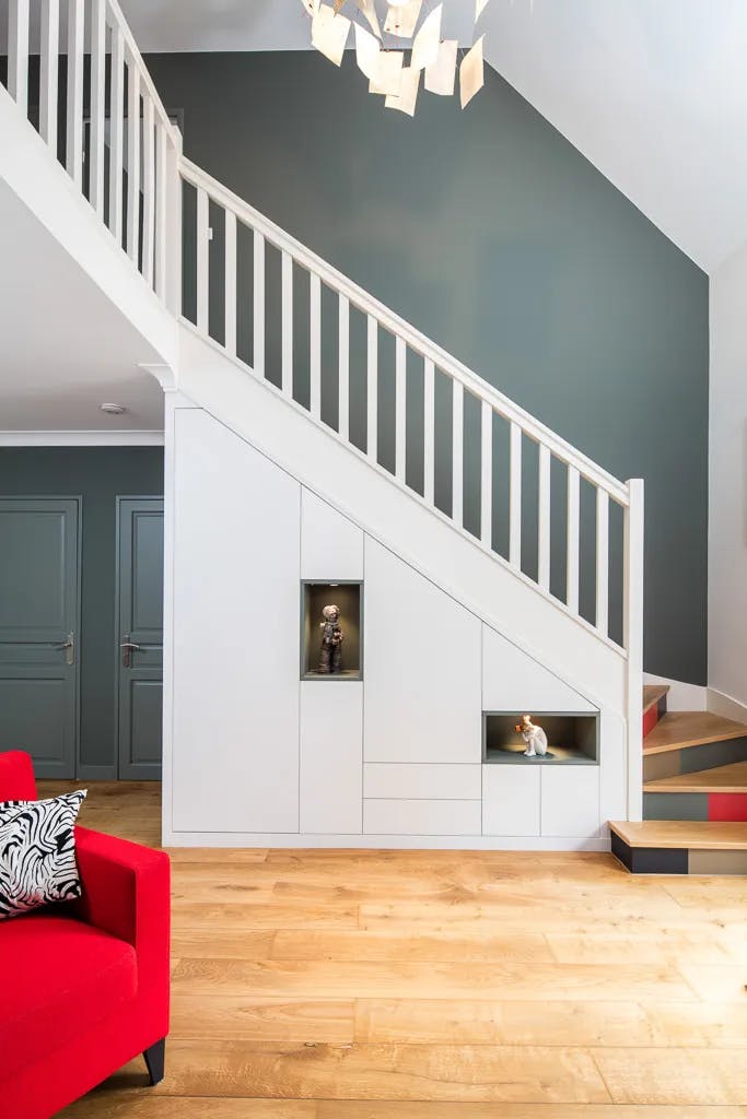 Le meuble a été conçu sur-mesure en MDF laqué blanc, avec des niches rétroéclairées pour ajouter de la profondeur et attirer l’attention sur les objets exposés. La finition soignée permet une continuité avec le reste de la pièce, et la simplicité du design maximise l’utilisation de l’espace disponible. Le choix des matériaux et la gestion des proportions permettent d’apporter une touche moderne et chic, tout en respectant les contraintes imposées par l’architecture de l’escalier.