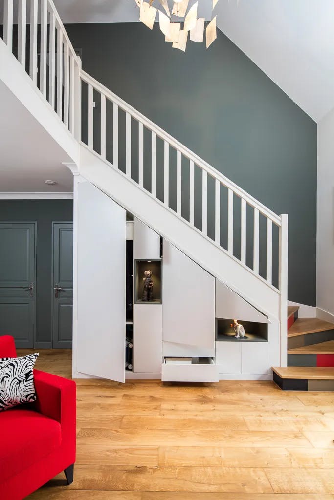 L’espace sous l’escalier, souvent mal exploité, représentait un défi en raison de la pente du plafond. L’équipe d'architectes a proposé une solution sur-mesure comprenant des niches lumineuses pour mettre en valeur des objets décoratifs, tout en intégrant des espaces de rangement discrets pour des articles du quotidien. Les portes sans poignées et l’aspect minimaliste du meuble permettent d’assurer une parfaite intégration à l’espace, offrant à la fois une fonctionnalité et un design élégant.
