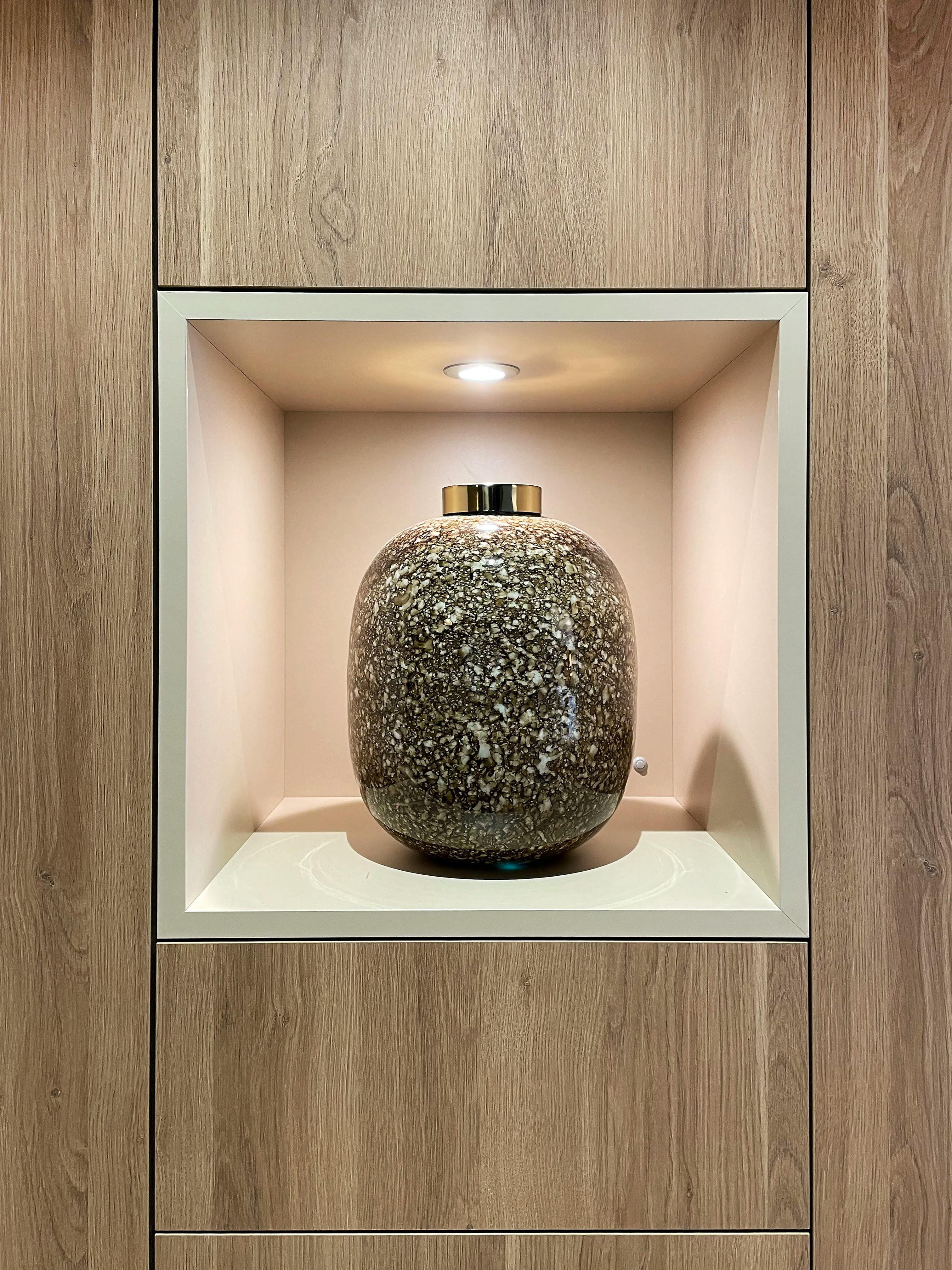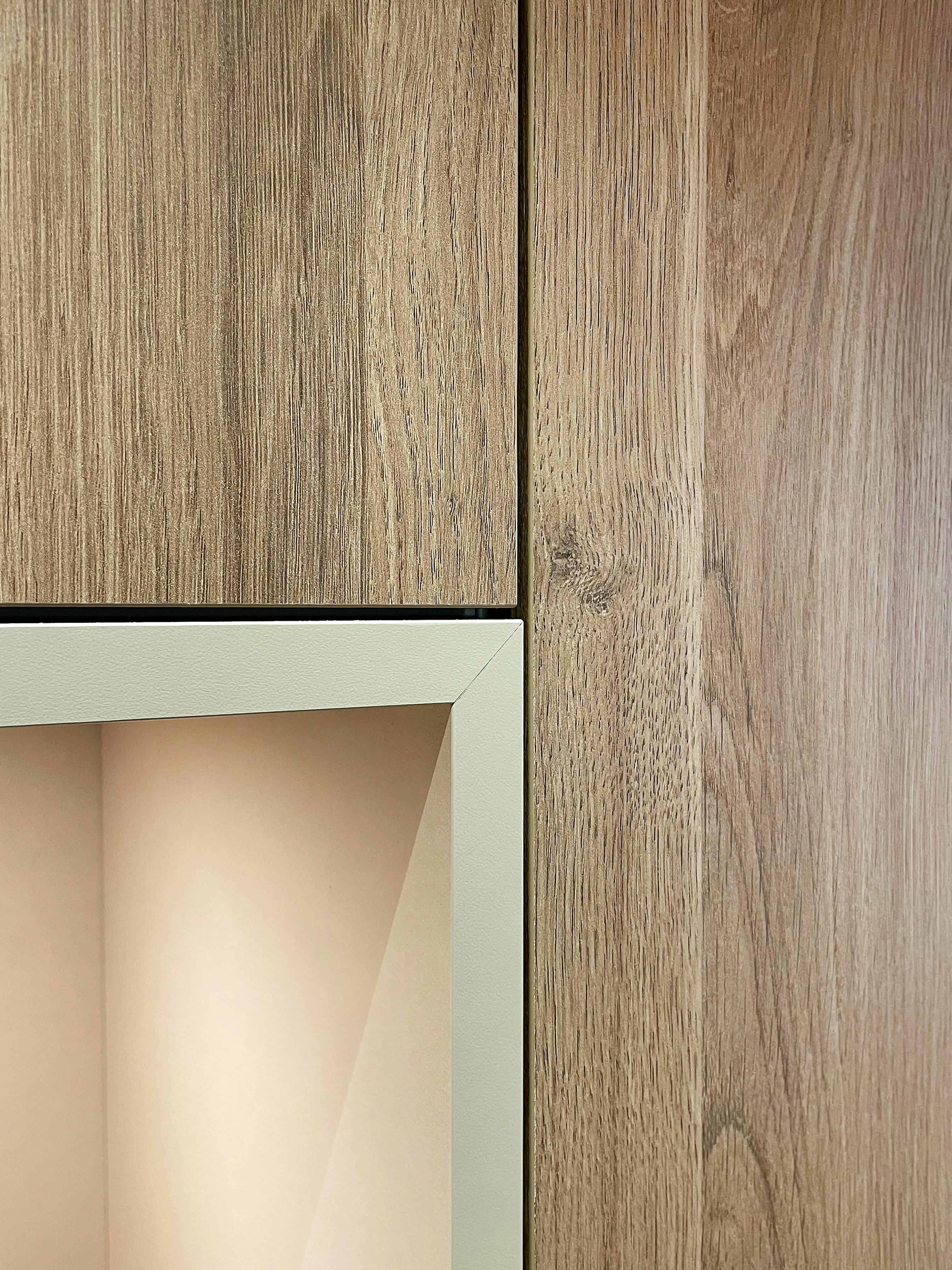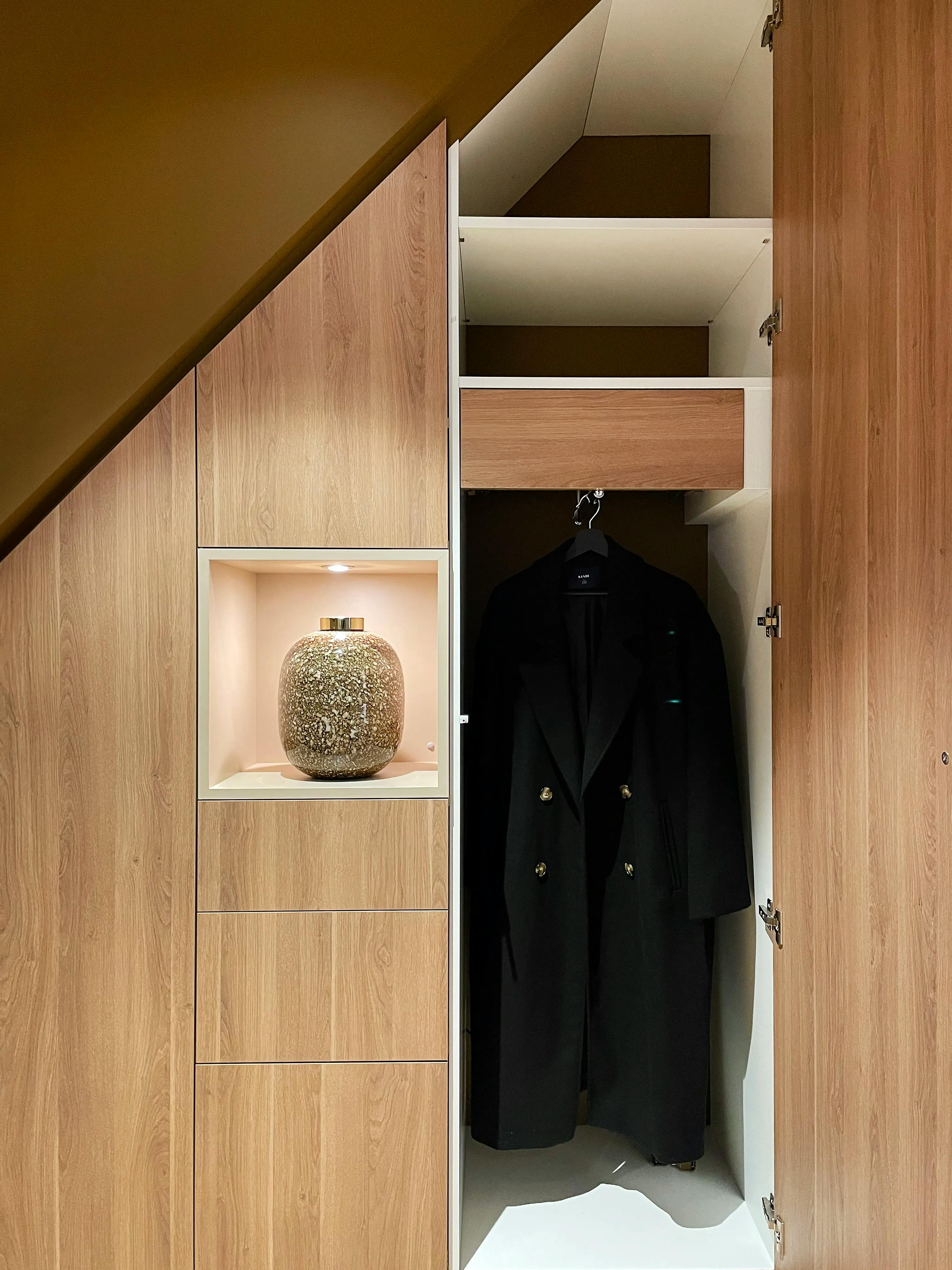 Un agencement sur-mesure était essentiel pour tirer parti de chaque centimètre sous cette pente. Chaque élément a été conçu pour maximiser l’espace, avec des niches éclairées pour mettre en valeur des objets décoratifs, et des tiroirs cachés pour une organisation optimale. La finition bois clair et les tons chaleureux créent une ambiance harmonieuse tout en étant moderne et épurée.