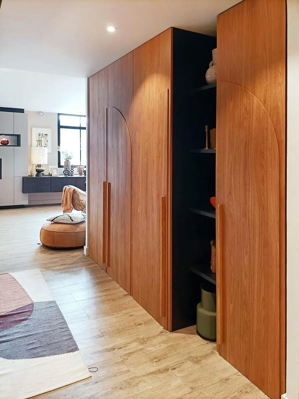 Le design a été pensé pour offrir une harmonie parfaite avec la pièce, utilisant un bois naturel aux tons chaleureux pour créer une atmosphère accueillante. Les portes du dressing présentent des courbes arquées, apportant une touche unique et élégante, tout en étant pratiques grâce à leur mécanisme de fermeture fluide. L’éclairage intégré met en valeur l’aspect du bois et permet une visibilité optimale, tandis que les poignées fines ajoutent une touche de raffinement au meuble.