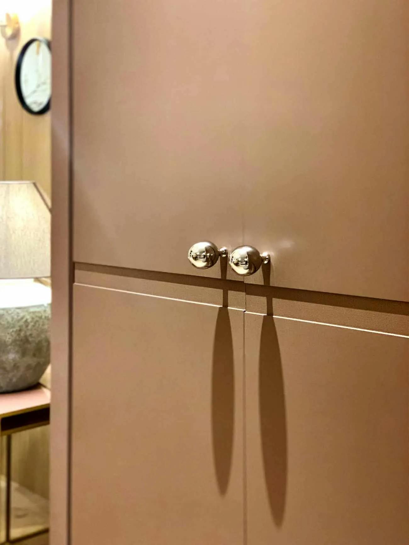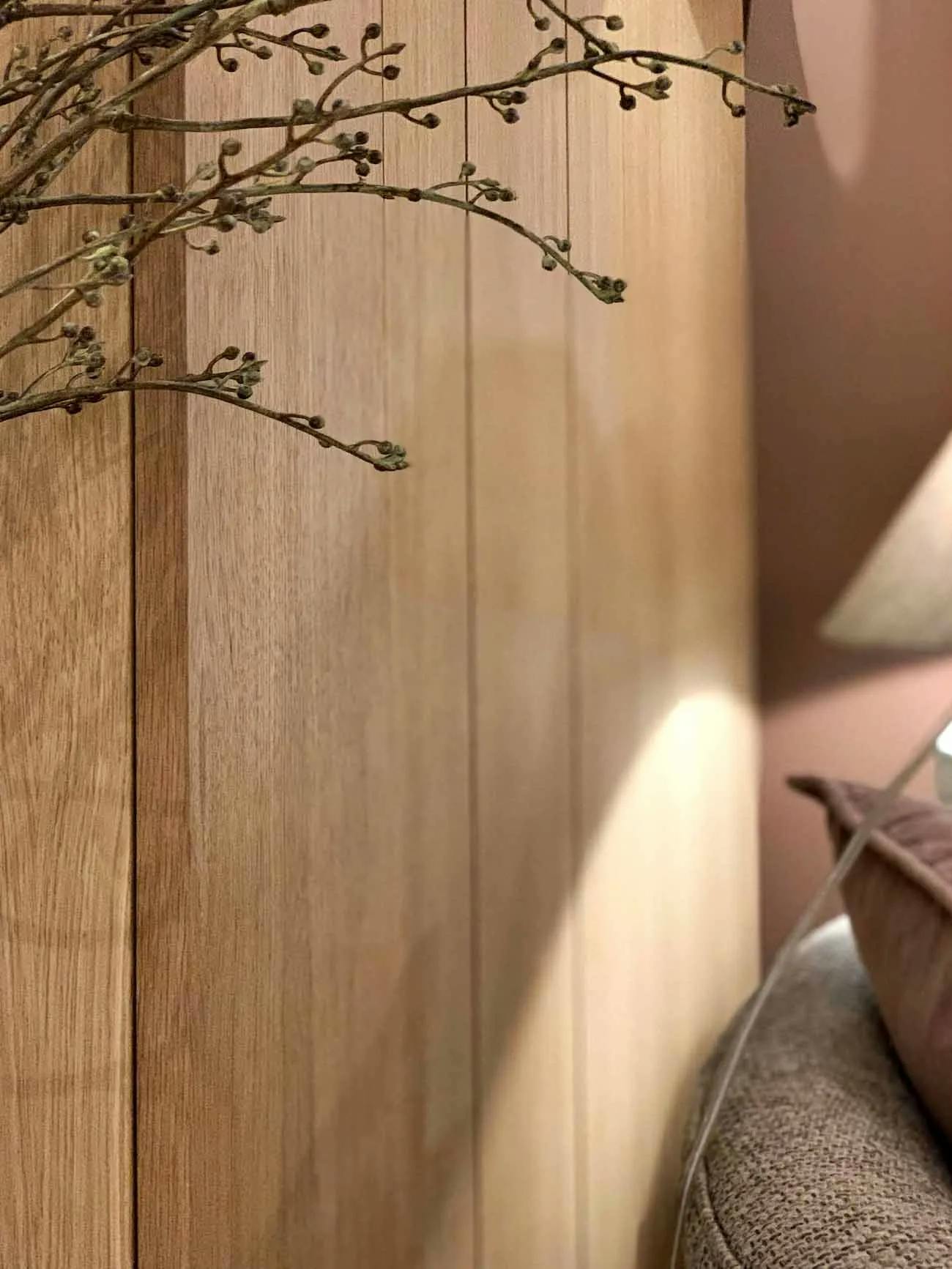 Le dressing est réalisé en finition mate colorée avec des portes sans poignées apparentes pour une intégration fluide. Un habillage en panneaux de bois avec rainures verticales prolonge visuellement le meuble et crée un effet enveloppant. L’association des tons naturels et du mobilier complémentaire apporte une atmosphère cosy et raffinée.