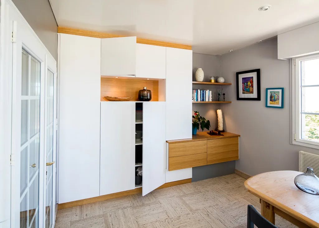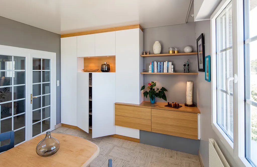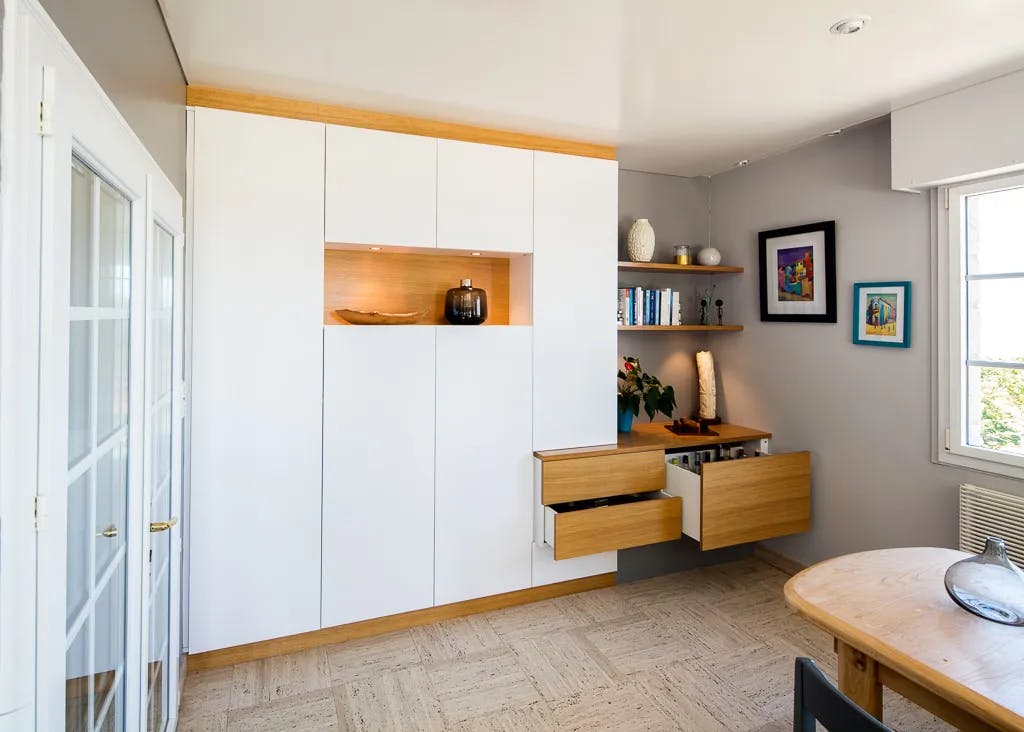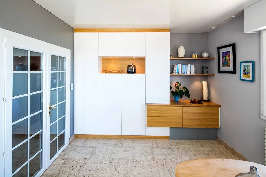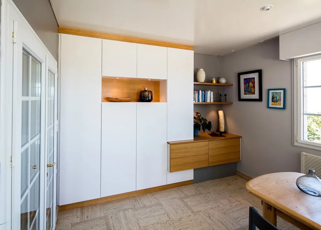 L’objectif principal était d’optimiser le volume de stockage sans surcharger la pièce, ce qui nécessitait une conception sur mesure. L’aménagement réalisé associe des placards en hauteur pour exploiter l’espace disponible et une niche éclairée qui apporte une touche décorative. Le mélange entre une finition blanche et des éléments en bois naturel crée une ambiance harmonieuse et chaleureuse. Enfin, l’ajout de modules suspendus et d’étagères ouvertes sur le côté offre une solution pratique tout en conservant un design léger et équilibré.