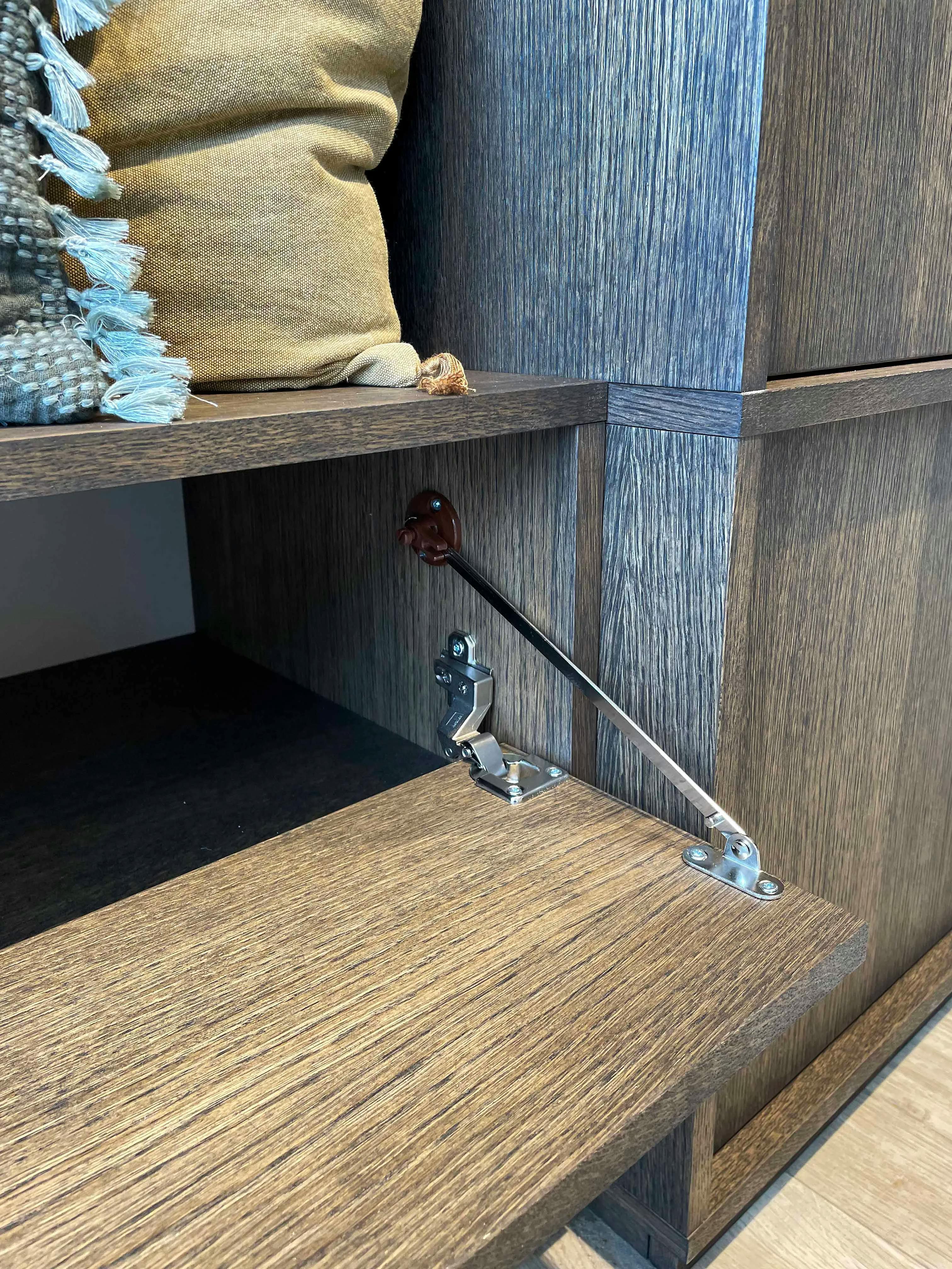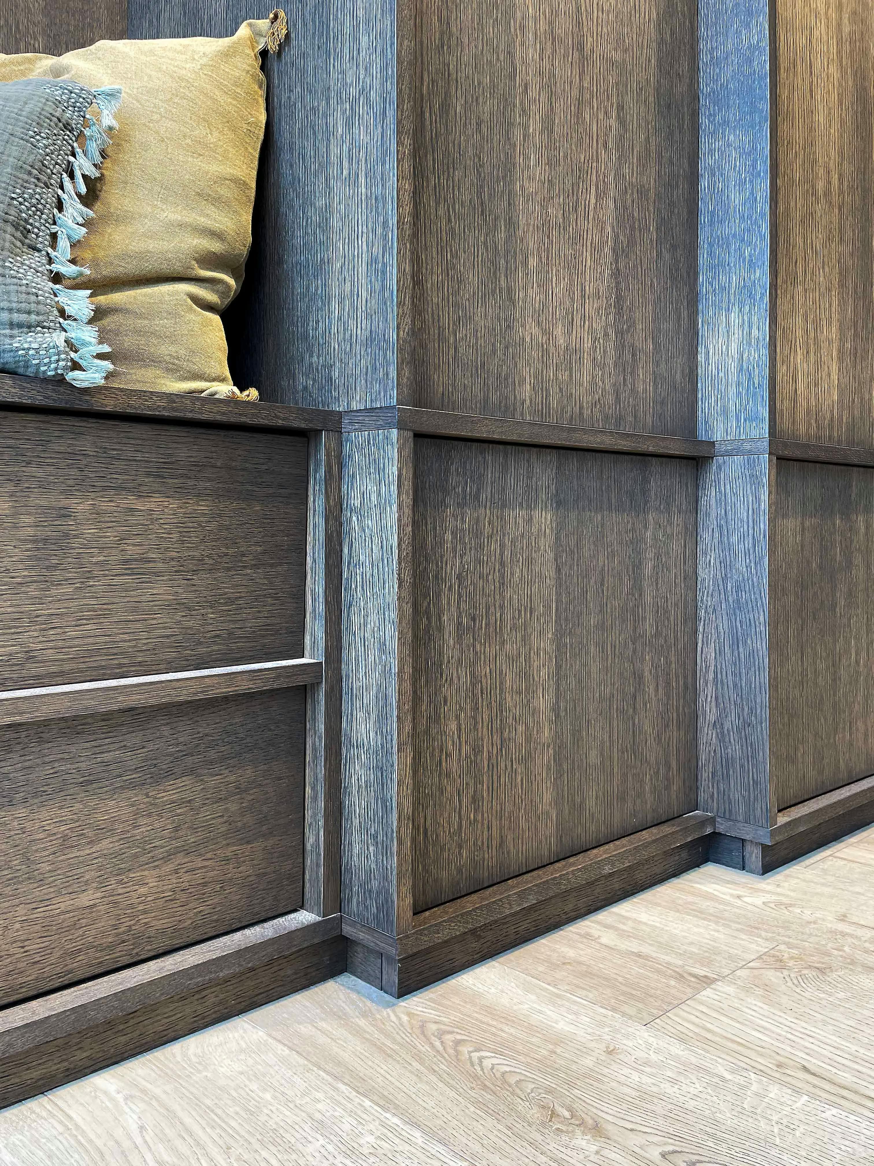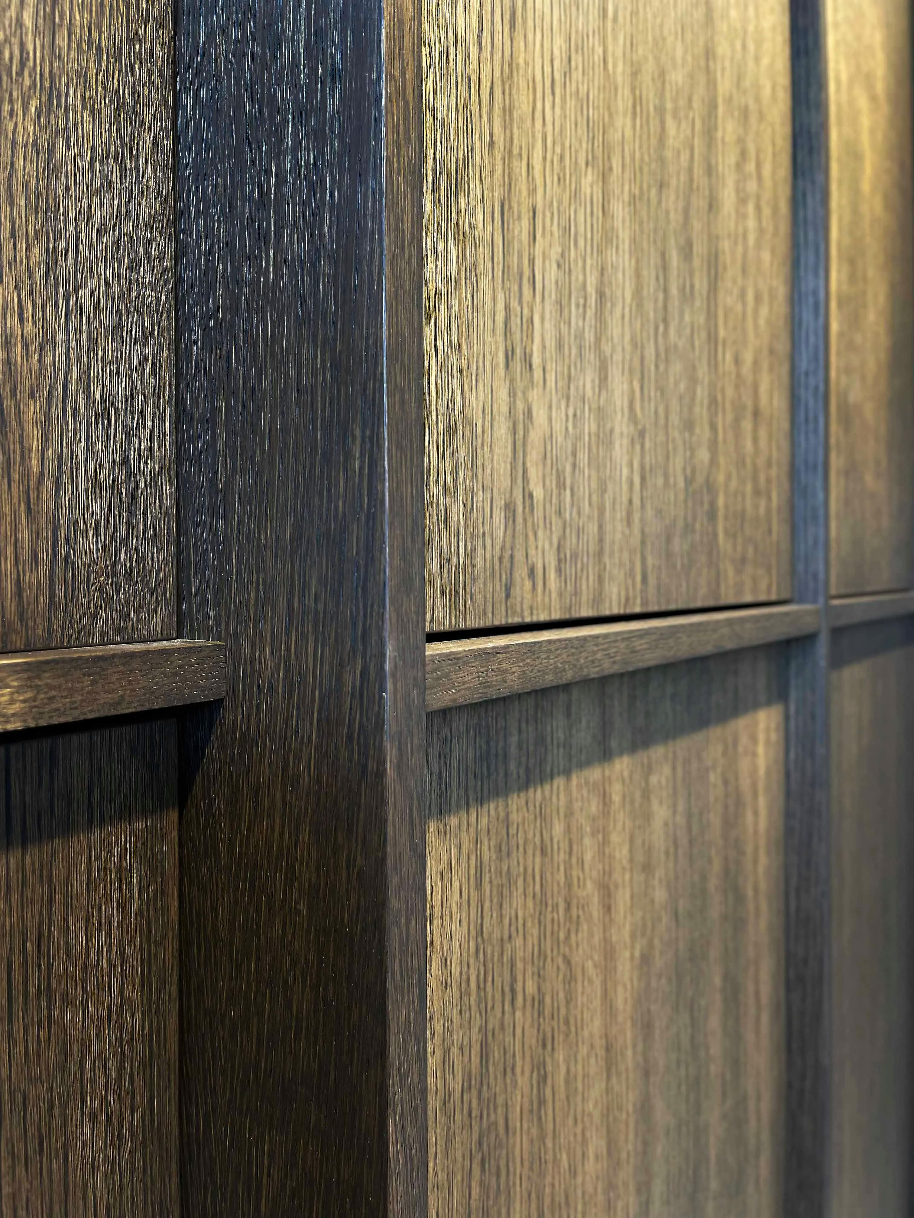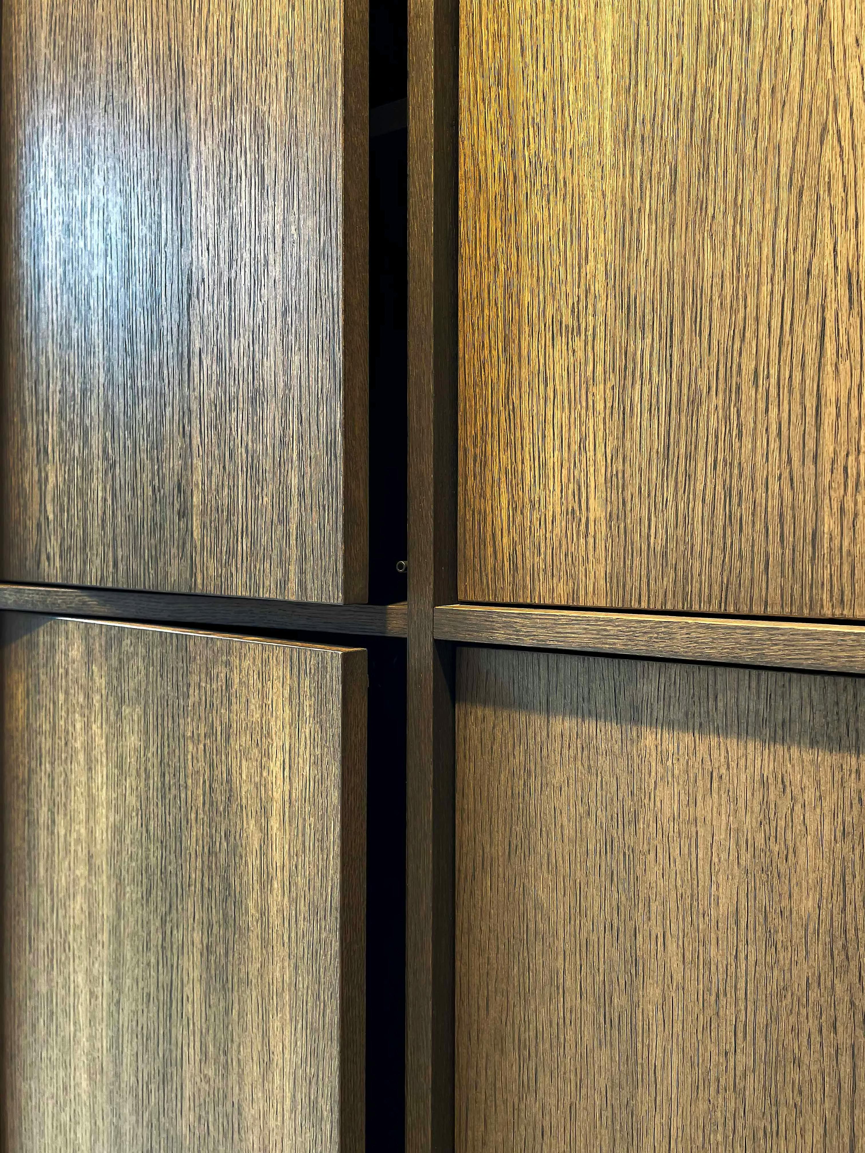Ce placard joue la carte du ton sur ton avec une conception intégrale en placage en chêne de fil. Le placage est une alternative attractive au bois massif. Il est stable dans le temps et permet une grande variété de finitions. Ici, il a été traité avec une huile de la gamme Rubio Monocoat, de la teinte Charcoal.