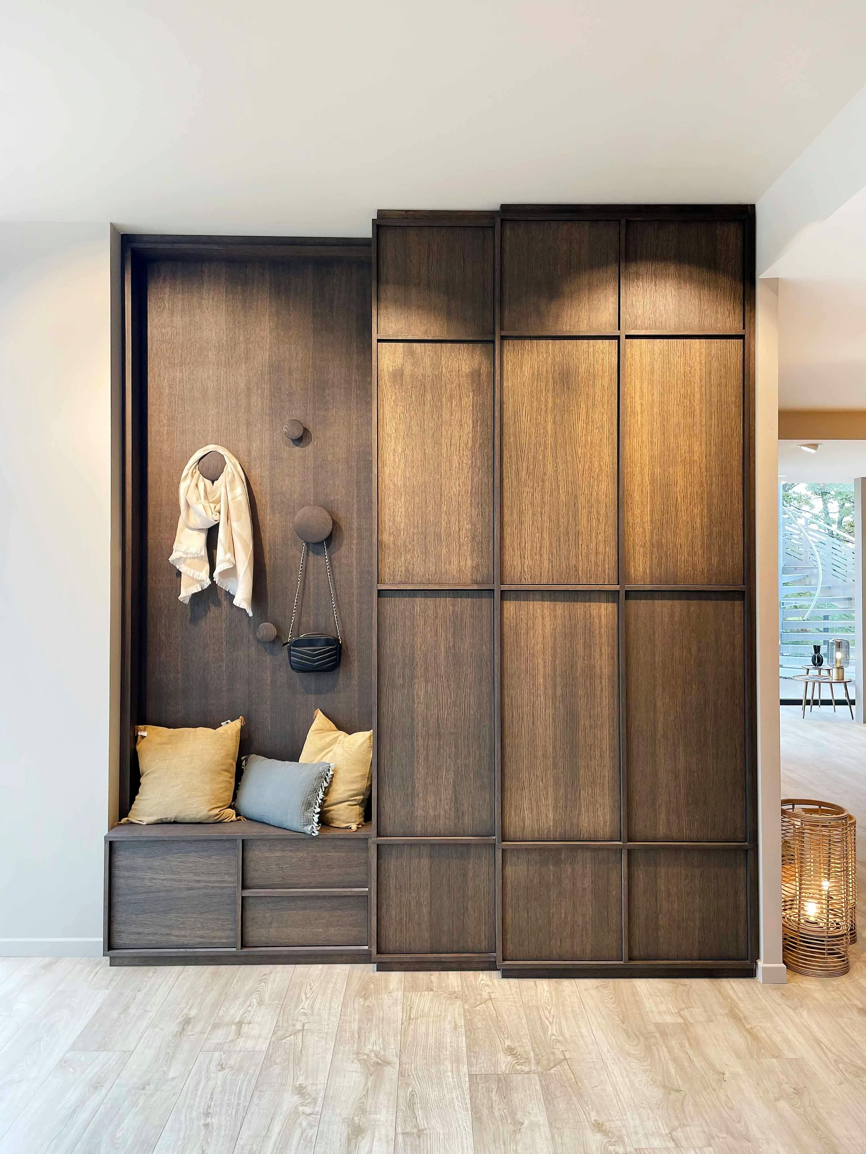 Placards d'entrée en bois foncé avec banquette intégrée