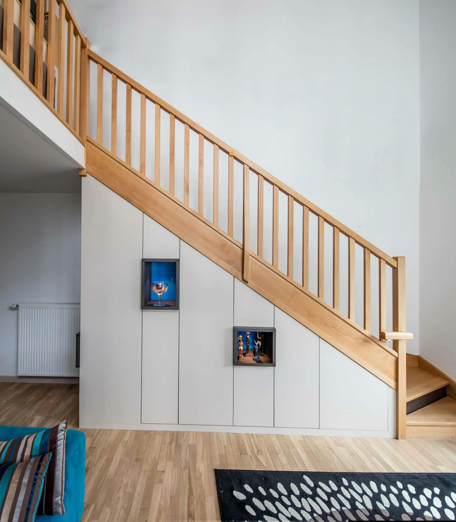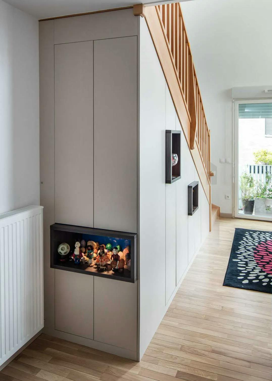 L’option du sur-mesure était essentielle pour maximiser le volume exploitable en épousant parfaitement la pente de l’escalier. Le choix des finitions s’est porté sur des façades sobres et claires, contrastées par le bois naturel de l’escalier pour un rendu chaleureux. Les niches rétroéclairées offrent une mise en valeur subtile des objets décoratifs, apportant une touche personnalisée à cet espace multifonctionnel.