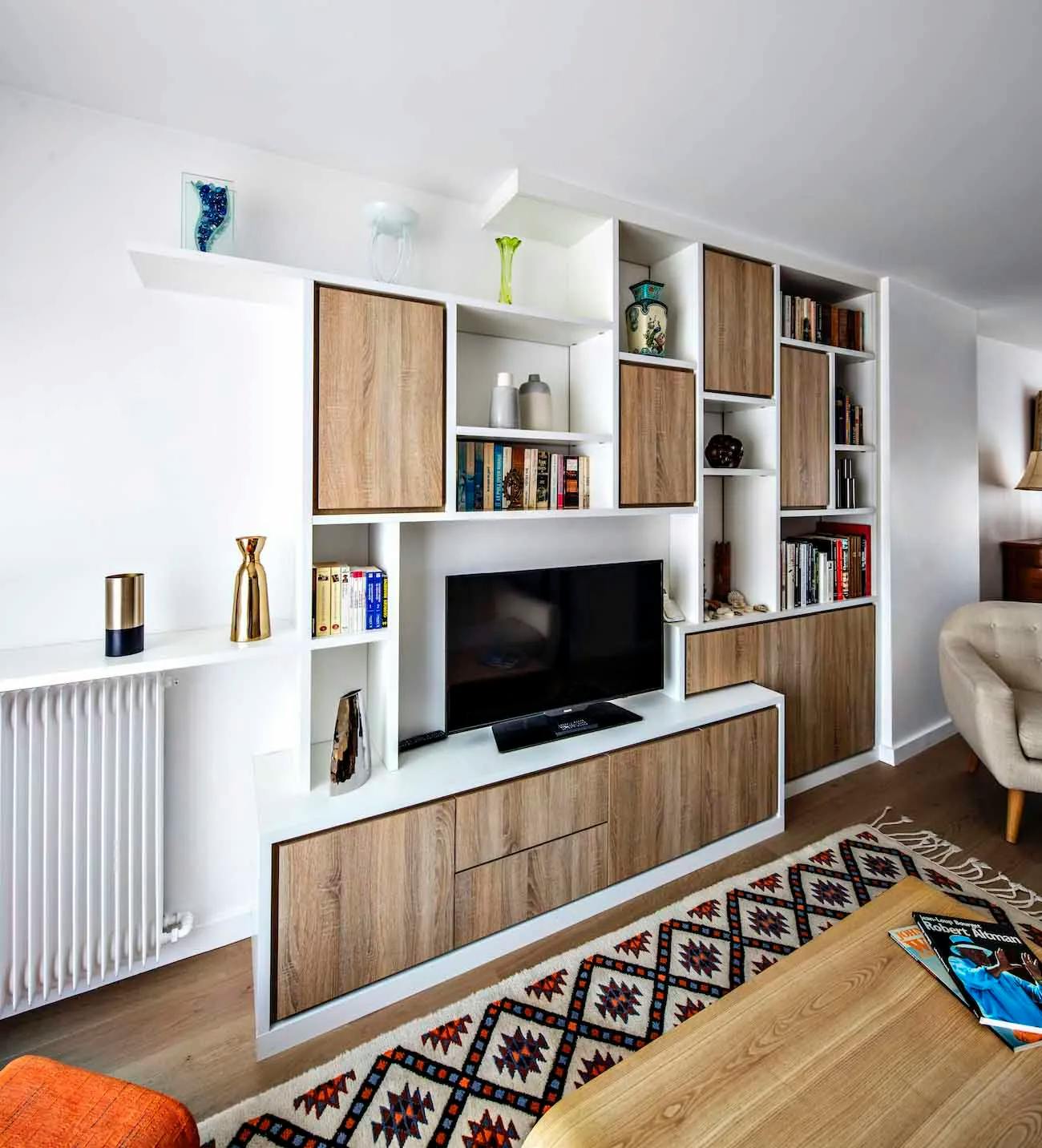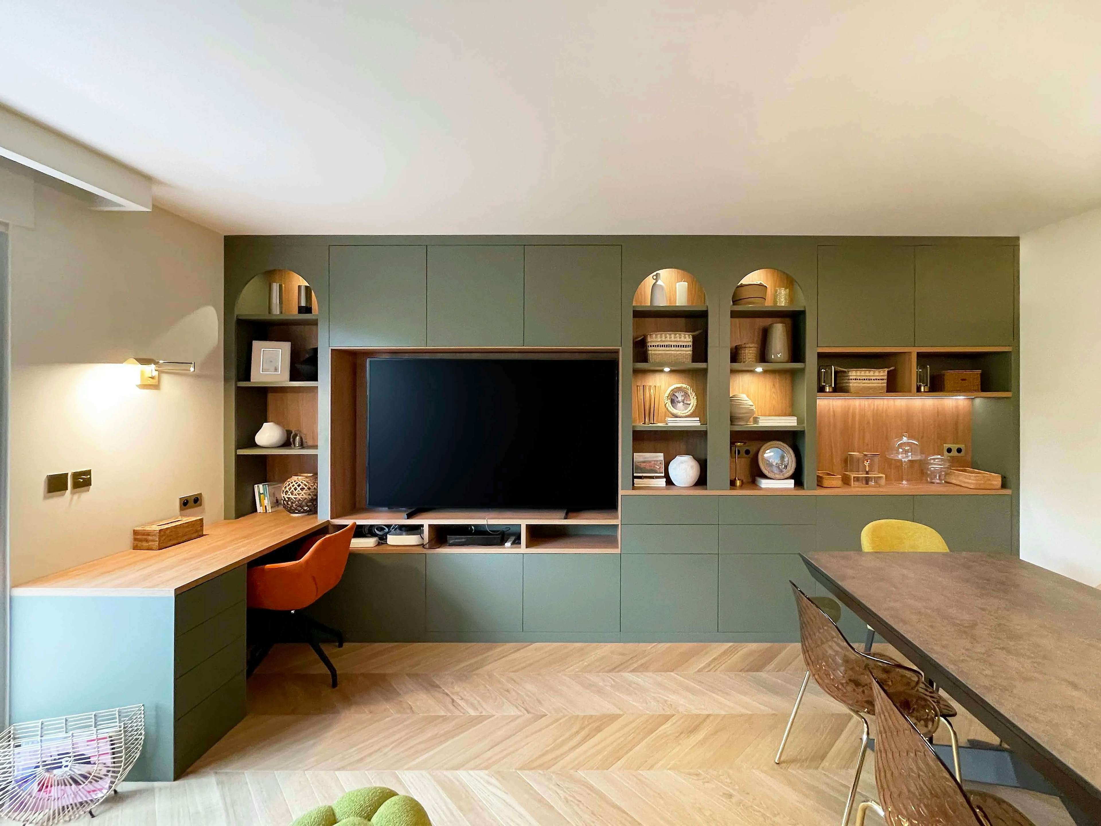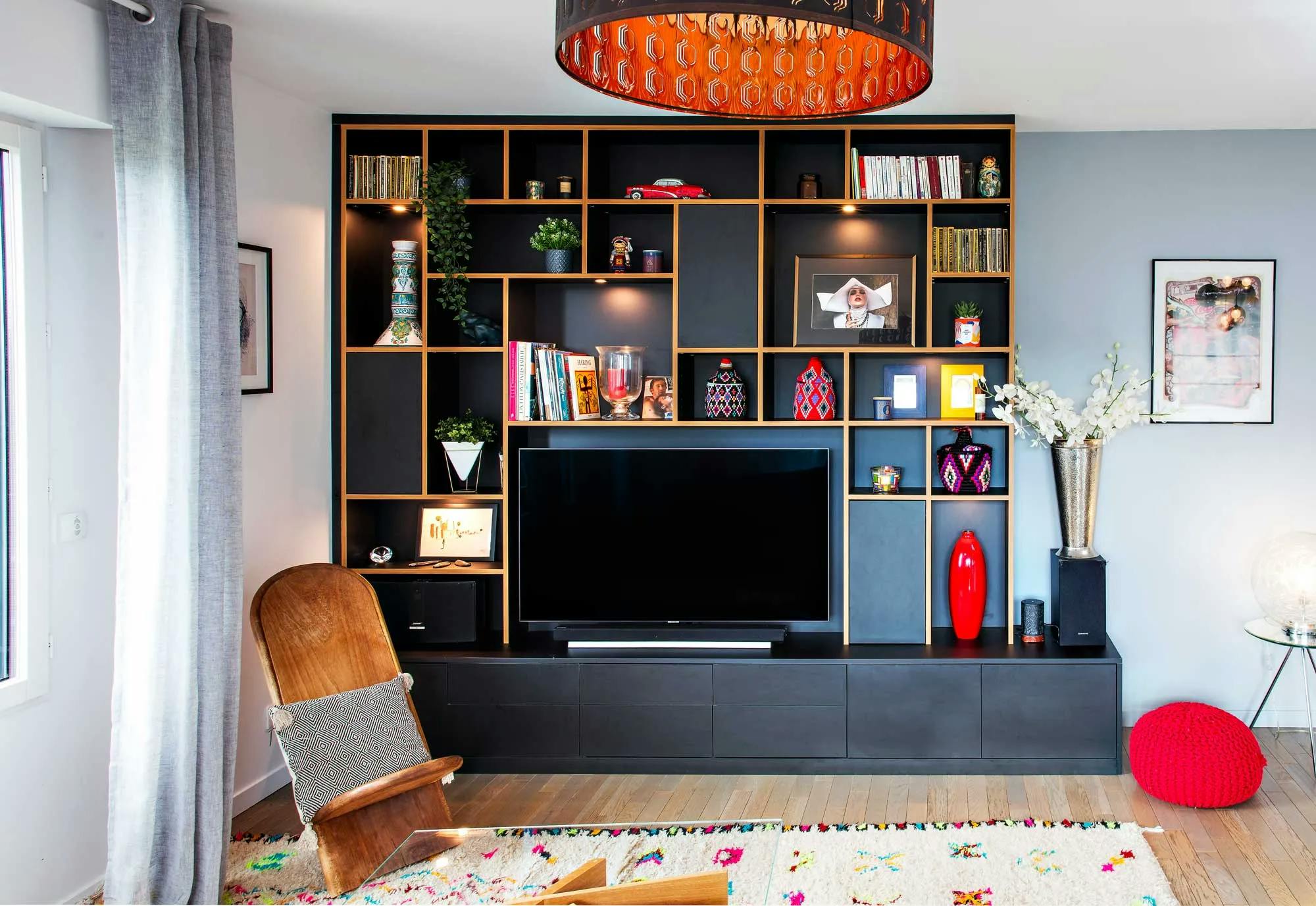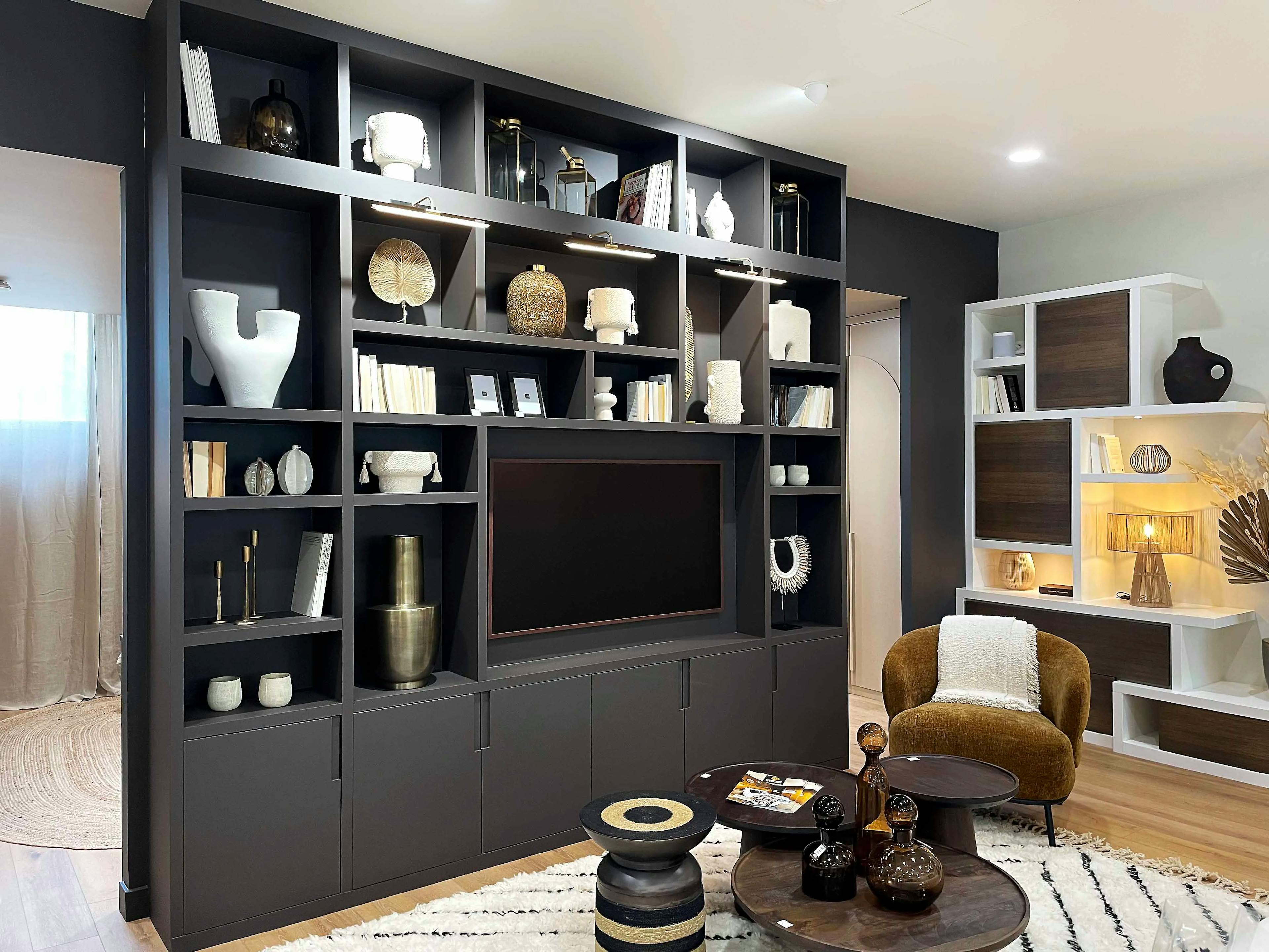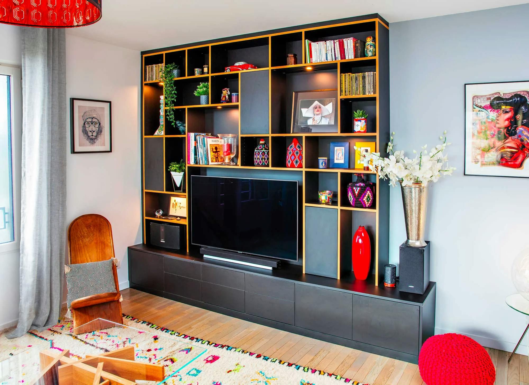 Un aménagement de meuble TV sur mesure va plus loin qu’un simple achat de meuble : c’est un projet d’agencement dans lequel vous allez réfléchir à l’organisation de votre pièce en fonction de vos habitudes, contraintes et envies. Plusieurs paramètres sont pris en compte : espace de circulation disponible, éclairage, disposition des prises, orientation du canapé, dimensions de la TV, éléments à ranger…En fonction de ces paramètres et de vos envies en matière de décoration d’intérieur, vous pourrez faire coïncider esthétique et fonctionnalité avec de nombreuses options de meubles TV : meuble bas, caissons suspendus, ensemble coordonné, bibliothèque complète….Le vrai sur-mesure permet de donner corps à vos envies en collant à votre personnalité.