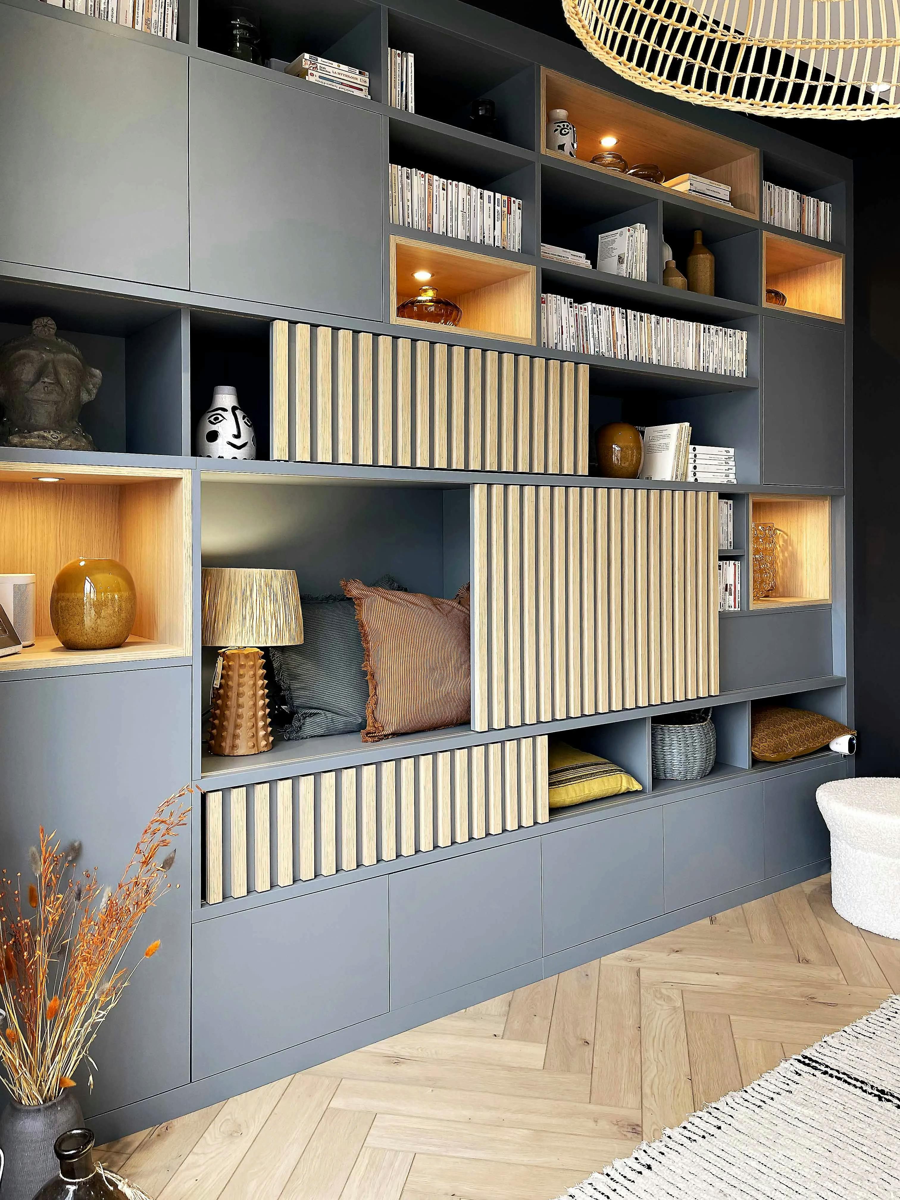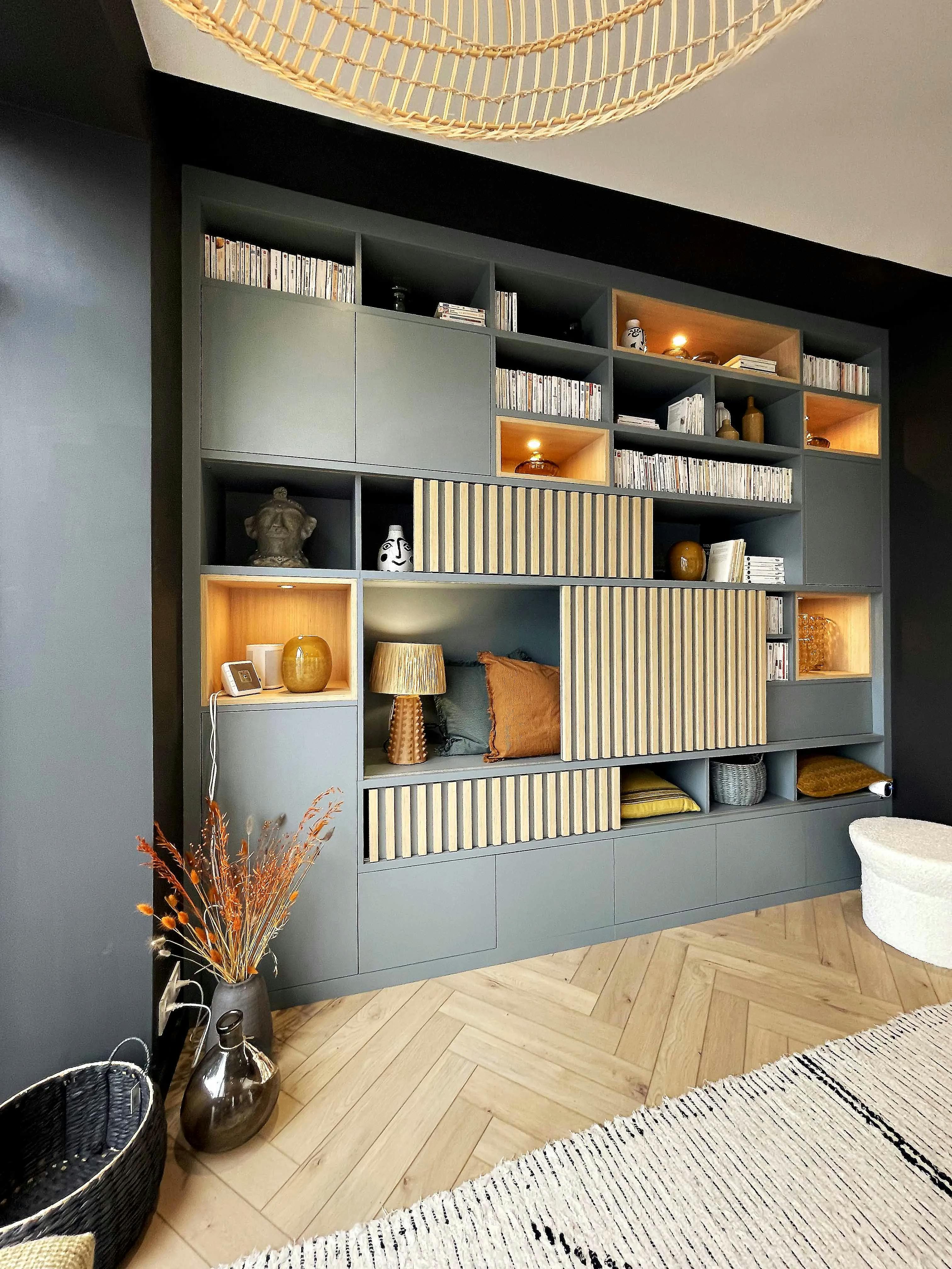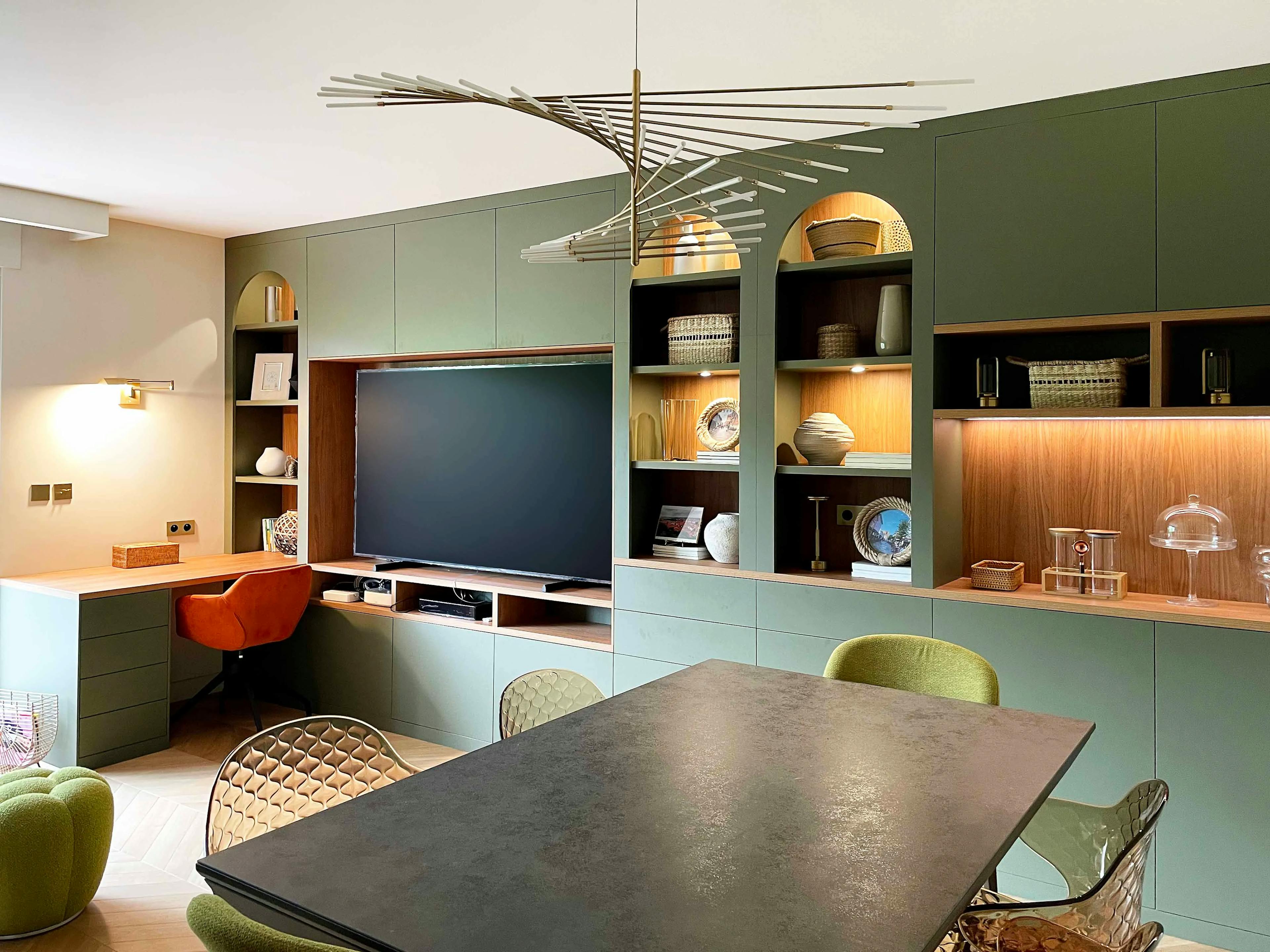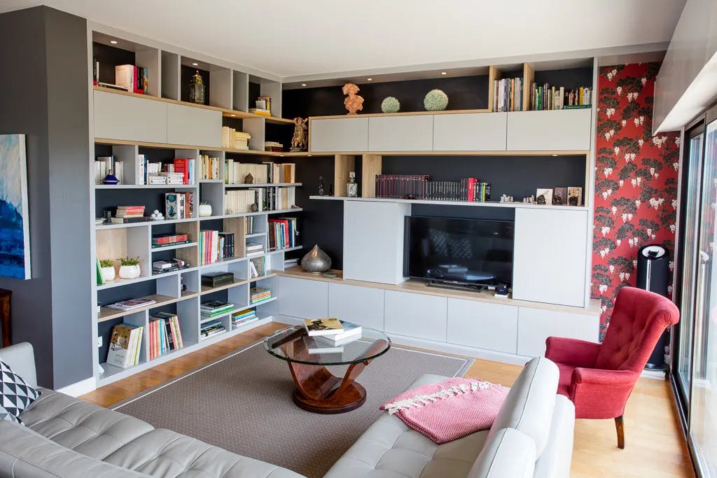 Un aménagement de meuble TV sur mesure va plus loin qu’un simple achat de meuble : c’est un projet d’agencement dans lequel vous allez réfléchir à l’organisation de votre pièce en fonction de vos habitudes, contraintes et envies. Plusieurs paramètres sont pris en compte : espace de circulation disponible, éclairage, disposition des prises, orientation du canapé, dimensions de la TV, éléments à ranger…En fonction de ces paramètres et de vos envies en matière de décoration d’intérieur, vous pourrez faire coïncider esthétique et fonctionnalité avec de nombreuses options de meubles TV : meuble bas, caissons suspendus, ensemble coordonné, bibliothèque complète….Le vrai sur-mesure permet de donner corps à vos envies en collant à votre personnalité.