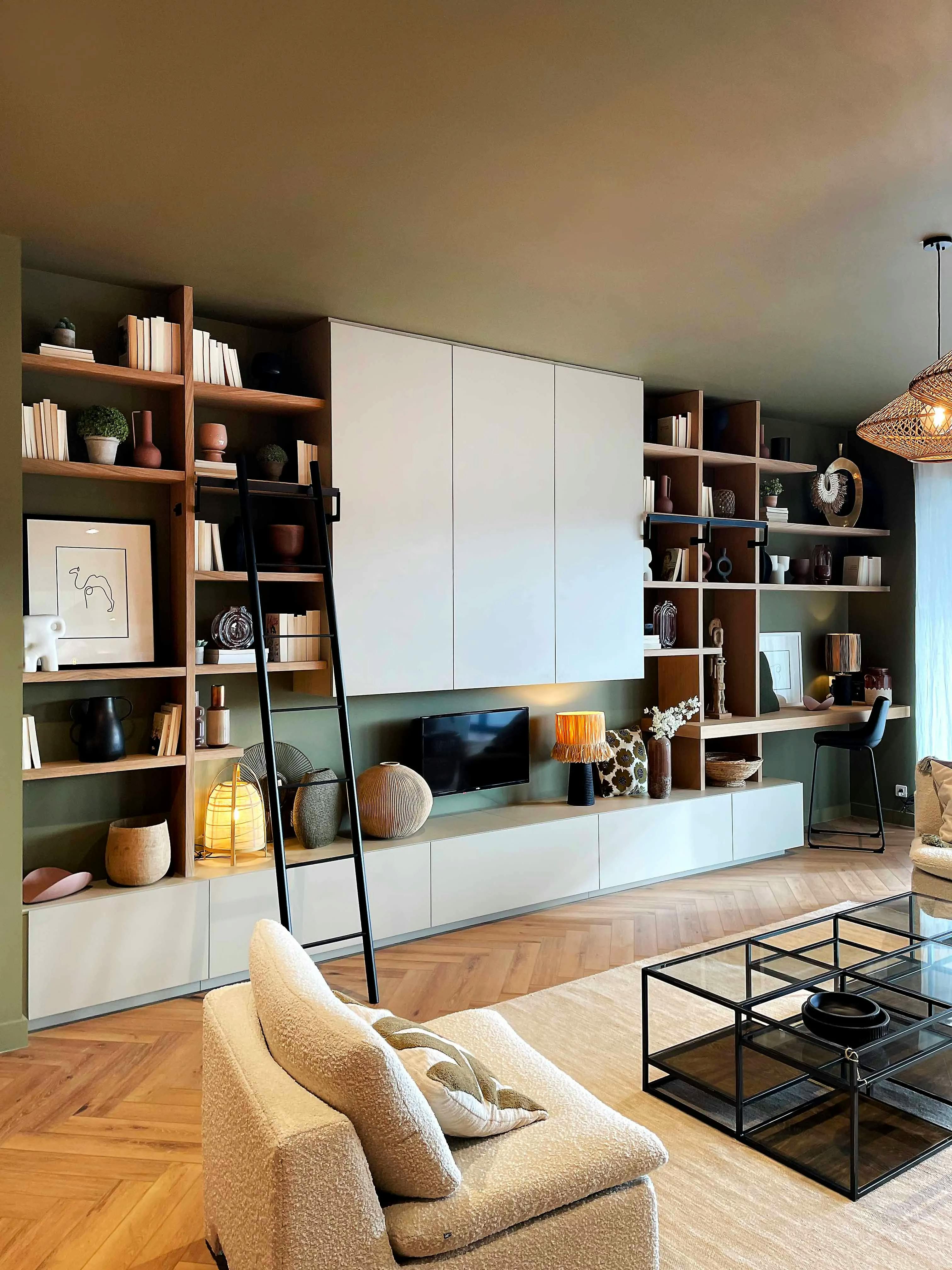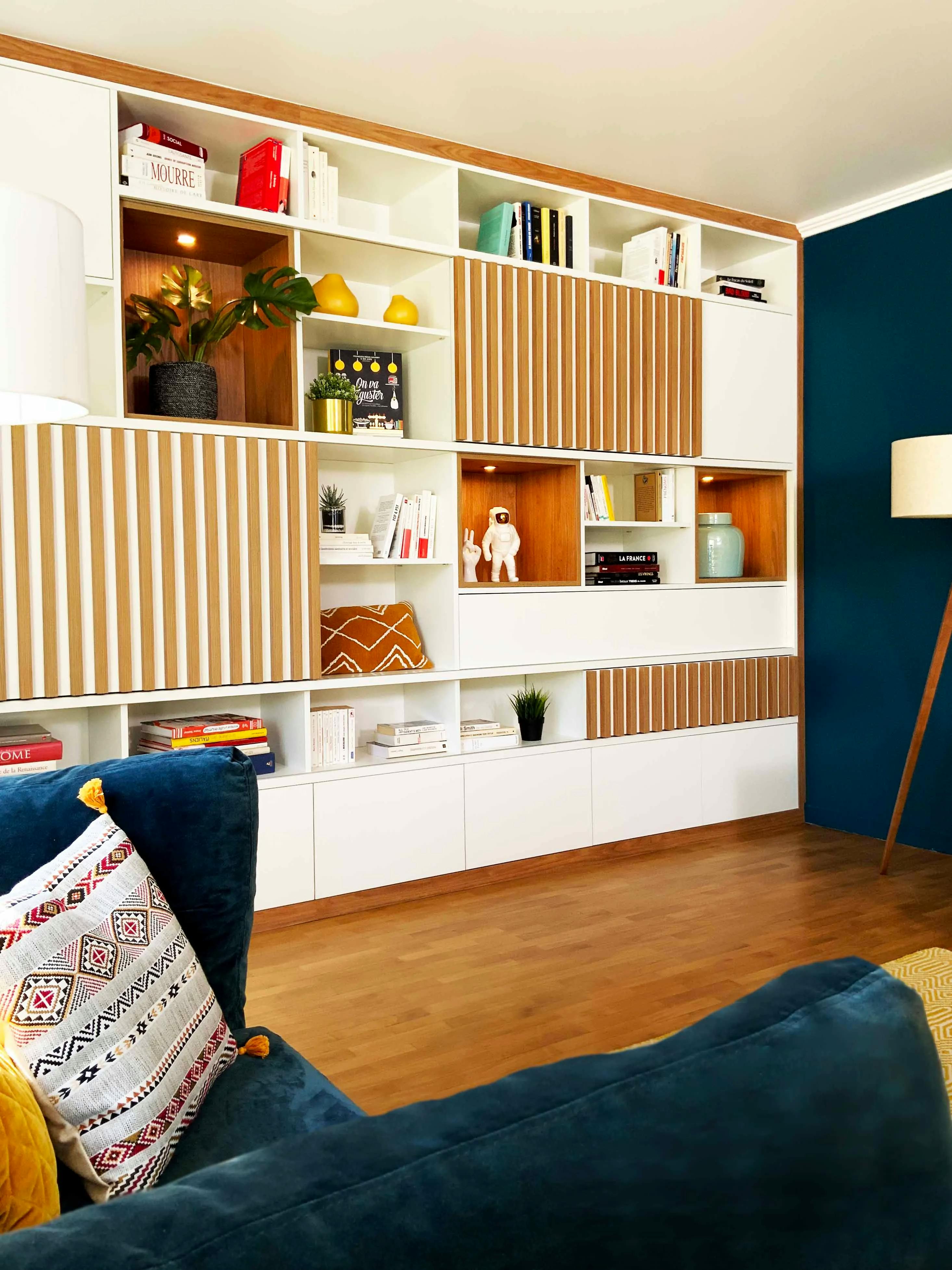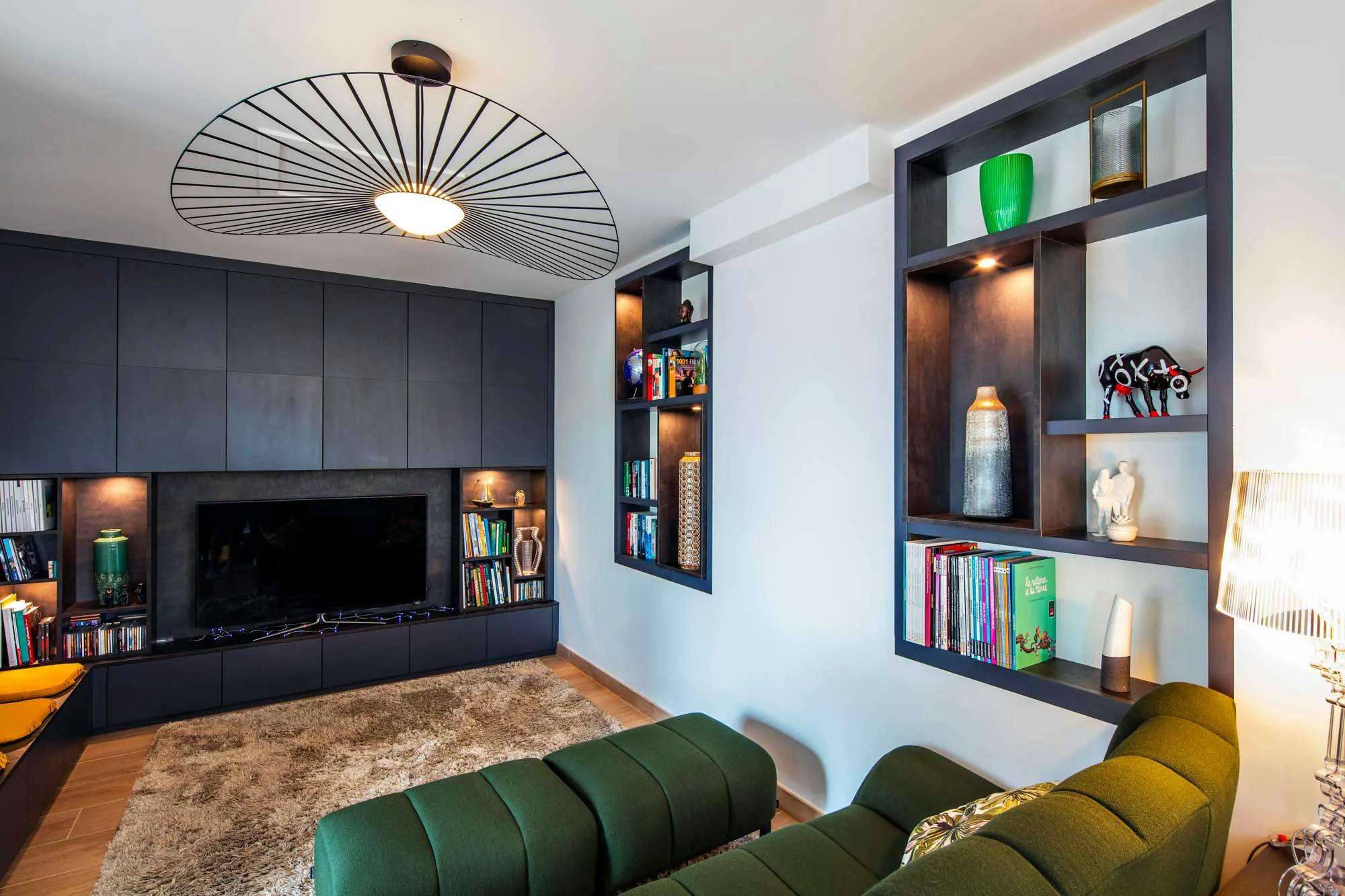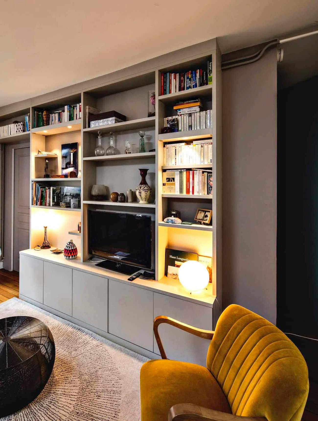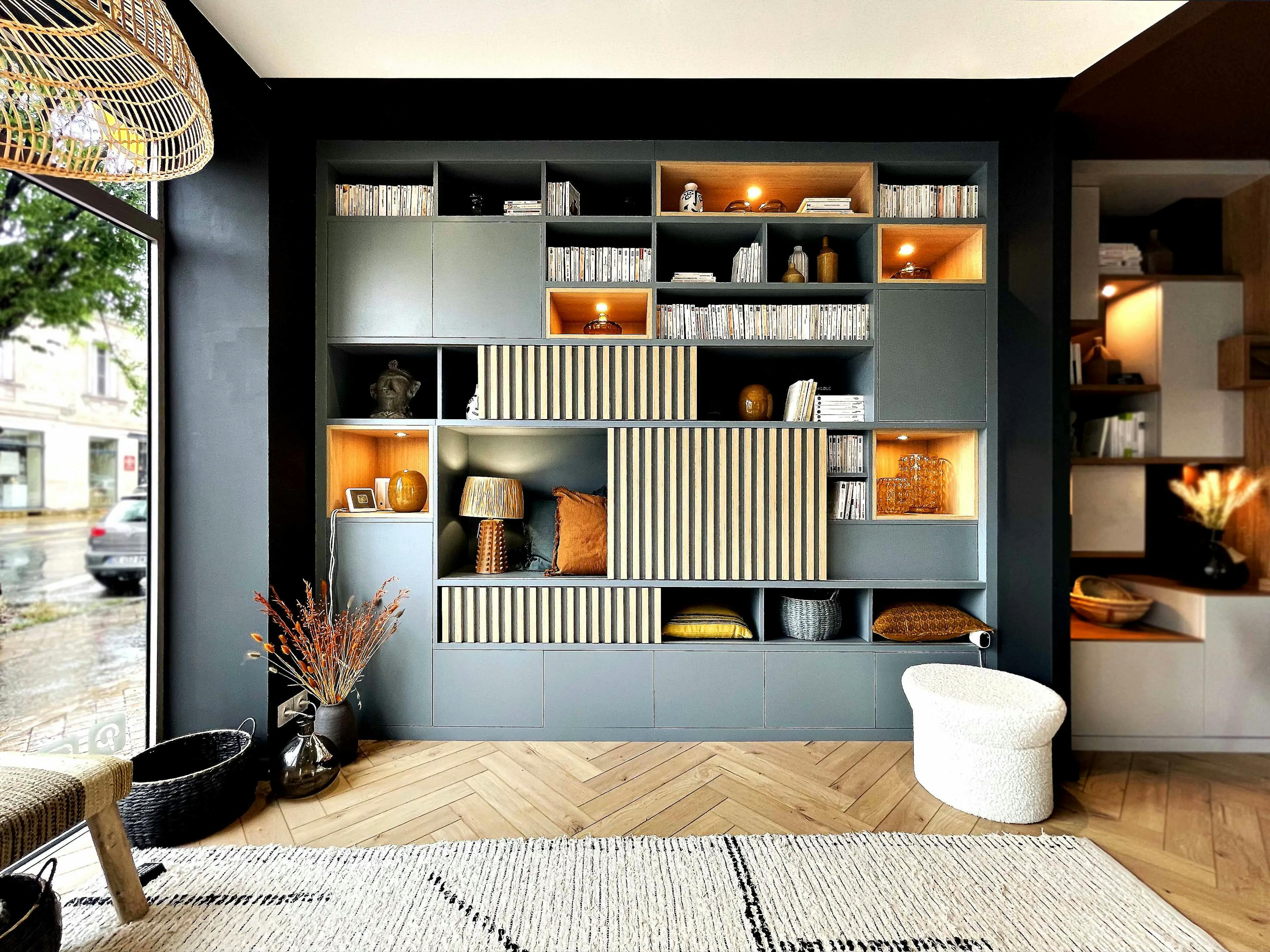 Un aménagement de meuble TV sur mesure va plus loin qu’un simple achat de meuble : c’est un projet d’agencement dans lequel vous allez réfléchir à l’organisation de votre pièce en fonction de vos habitudes, contraintes et envies. Plusieurs paramètres sont pris en compte : espace de circulation disponible, éclairage, disposition des prises, orientation du canapé, dimensions de la TV, éléments à ranger…En fonction de ces paramètres et de vos envies en matière de décoration d’intérieur, vous pourrez faire coïncider esthétique et fonctionnalité avec de nombreuses options de meubles TV : meuble bas, caissons suspendus, ensemble coordonné, bibliothèque complète….Le vrai sur-mesure permet de donner corps à vos envies en collant à votre personnalité.