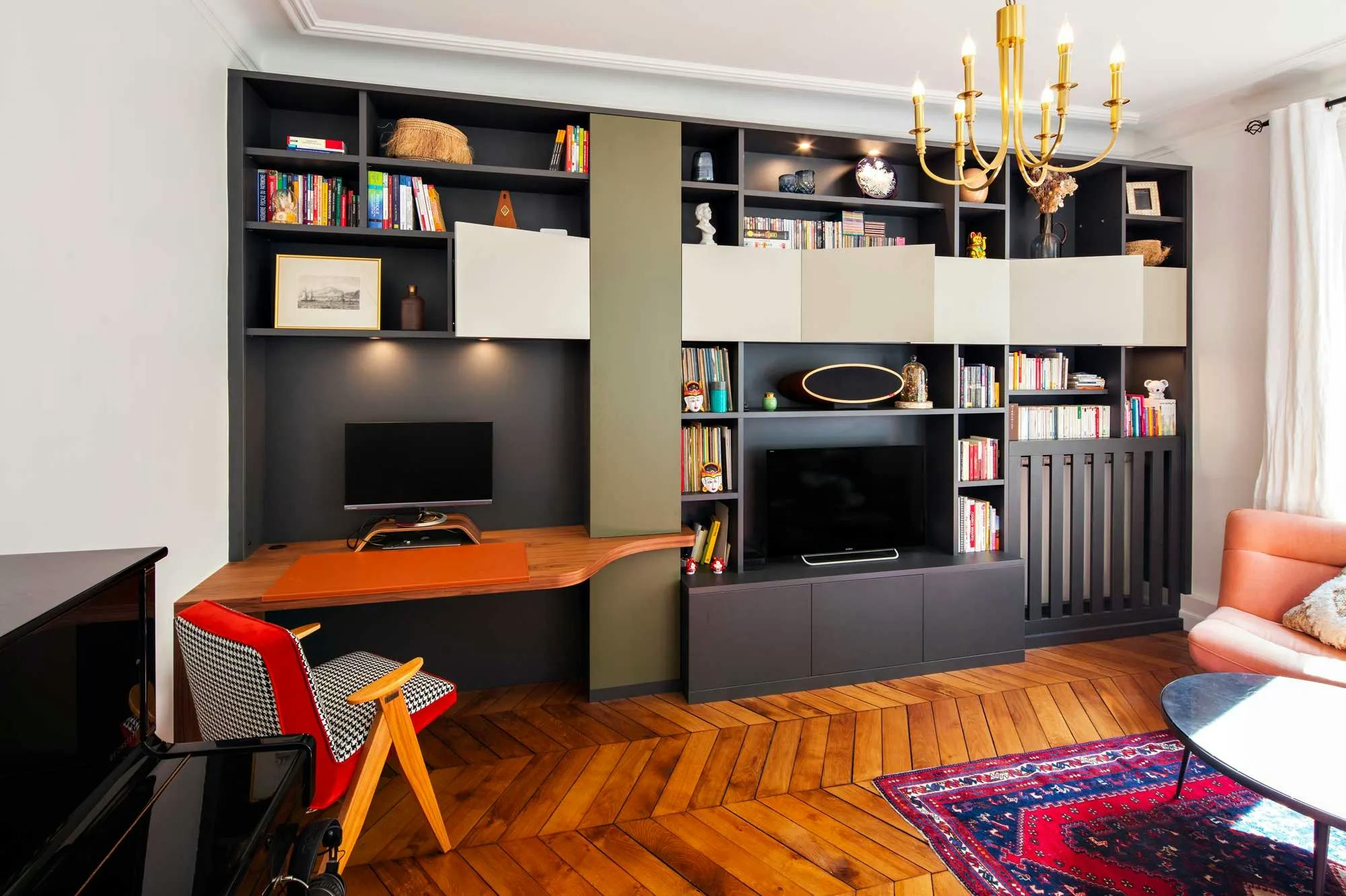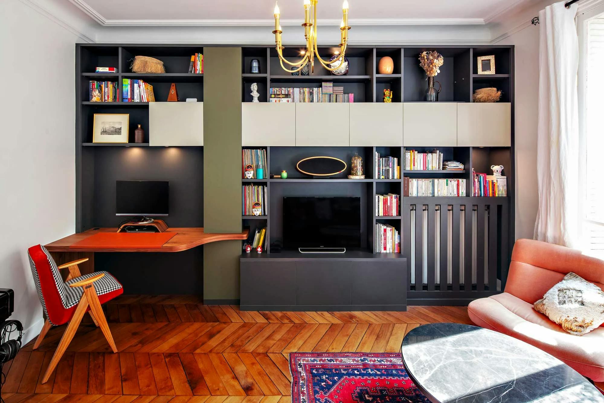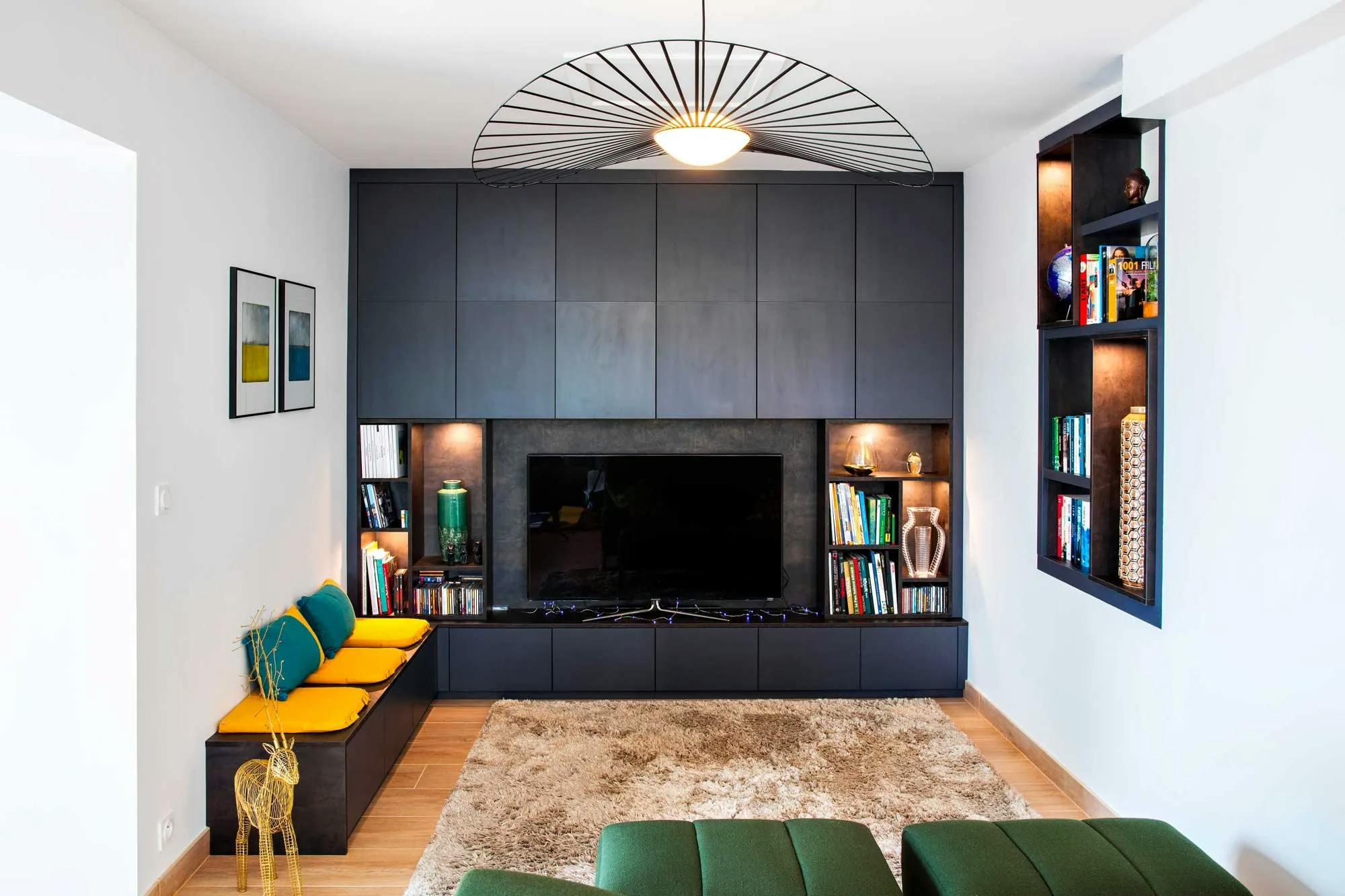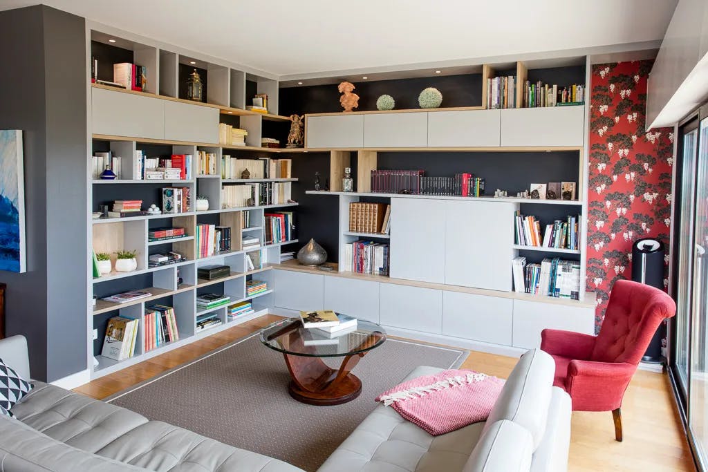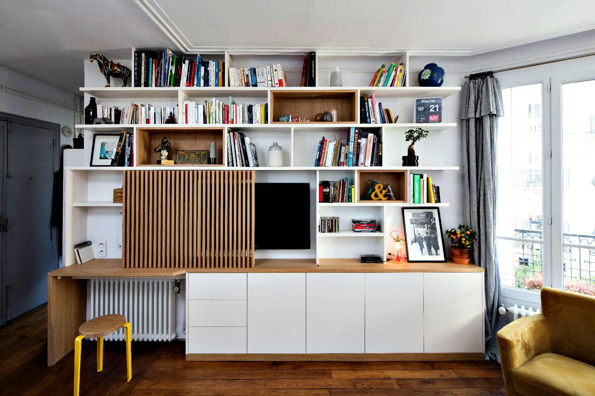Un aménagement de meuble TV sur mesure va plus loin qu’un simple achat de meuble : c’est un projet d’agencement dans lequel vous allez réfléchir à l’organisation de votre pièce en fonction de vos habitudes, contraintes et envies. Plusieurs paramètres sont pris en compte : espace de circulation disponible, éclairage, disposition des prises, orientation du canapé, dimensions de la TV, éléments à ranger…En fonction de ces paramètres et de vos envies en matière de décoration d’intérieur, vous pourrez faire coïncider esthétique et fonctionnalité avec de nombreuses options de meubles TV : meuble bas, caissons suspendus, ensemble coordonné, bibliothèque complète….Le vrai sur-mesure permet de donner corps à vos envies en collant à votre personnalité.
